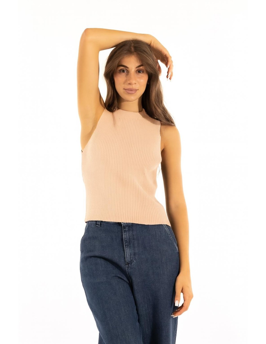 Kontatto top em malha canelada, corte justo que modela com conforto. Fio macio e ligeiramente elástico, textura compacta. Gola redonda rente com ligeiro franzido na parte de trás e acabamento limpo nas cavas para um look essencial. Perfeito sozinho ou por baixo de um blazer: ideal para escritório, dia a dia e aperitivos.