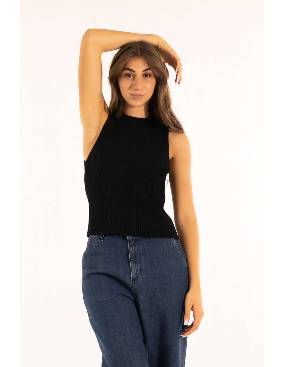 Kontatto top em malha canelada, corte justo que modela com conforto. Fio macio e ligeiramente elástico, textura compacta. Gola redonda rente com ligeiro franzido na parte de trás e acabamento limpo nas cavas para um look essencial. Perfeito sozinho ou por baixo de um blazer: ideal para escritório, dia a dia e aperitivos.