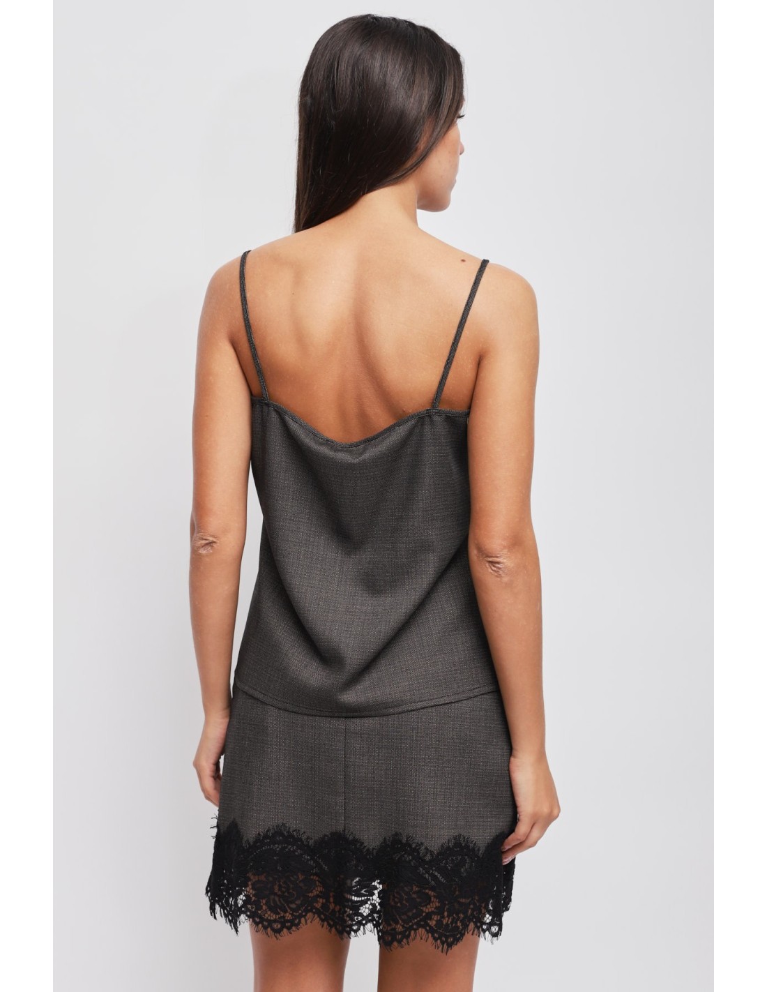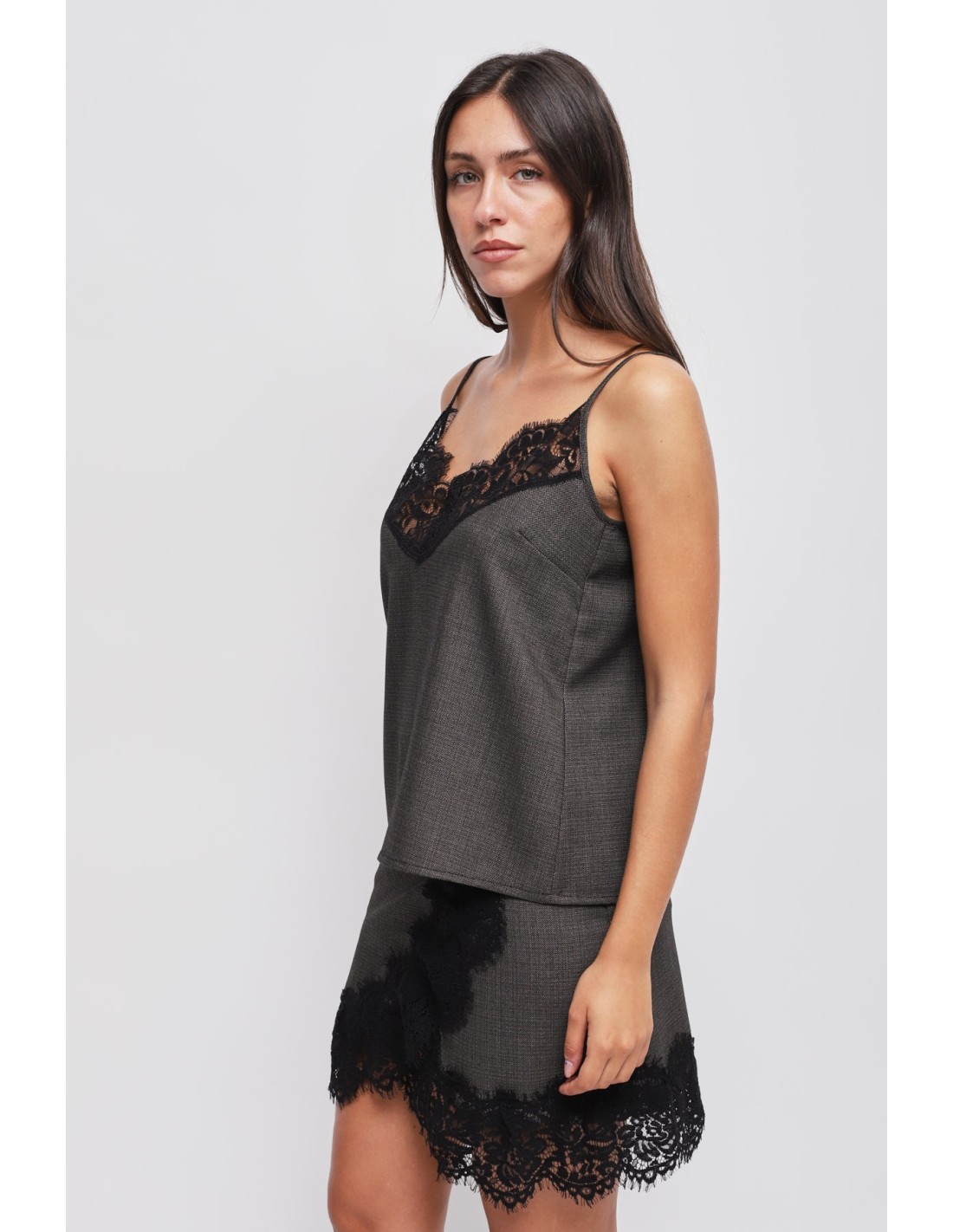 Maryley assina um top com corte macio e fluido, em tecido leve com efeito microtextura. A renda trabalhada contorna o decote em V e as alças finas valorizam a silhueta. Versátil: por baixo de um blazer para o escritório, usado sozinho para o aperitivo. Conforto leve, feminilidade imediata.