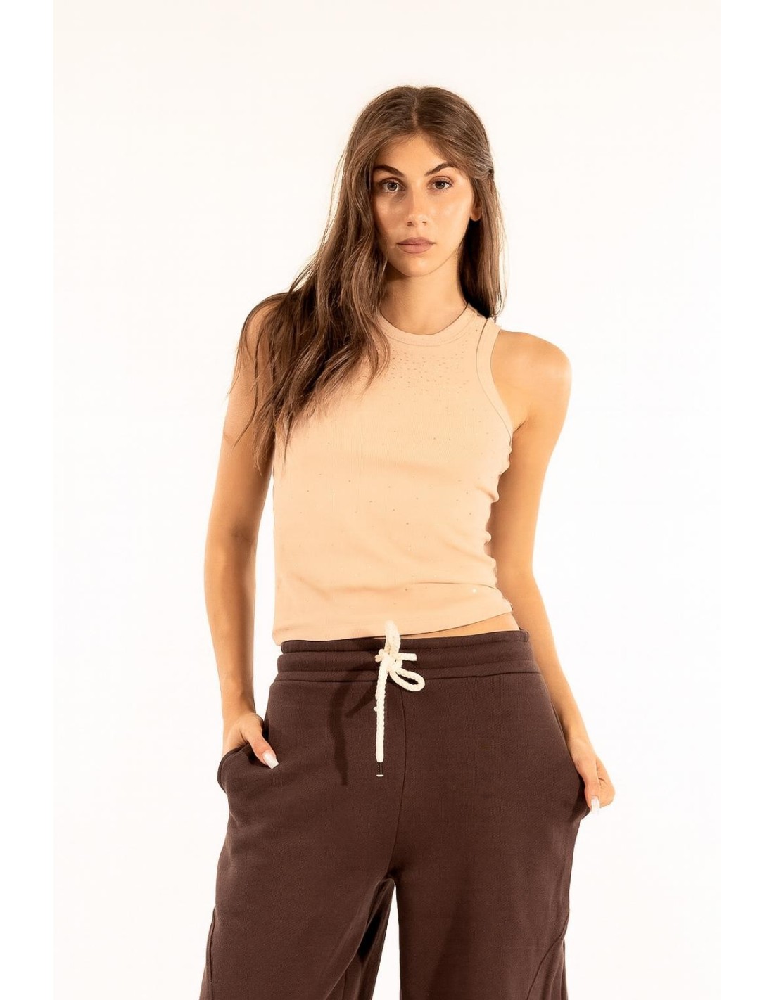 Top justo com canelado assinado Kontatto: corte slim que esculpe a silhueta sem apertar. Malha macia e respirável com micro-strass por todo o lado e cava americana que valoriza as linhas. Perfeito sozinho para o aperitivo ou por baixo de um blazer no escritório; também versátil para o uso diário.