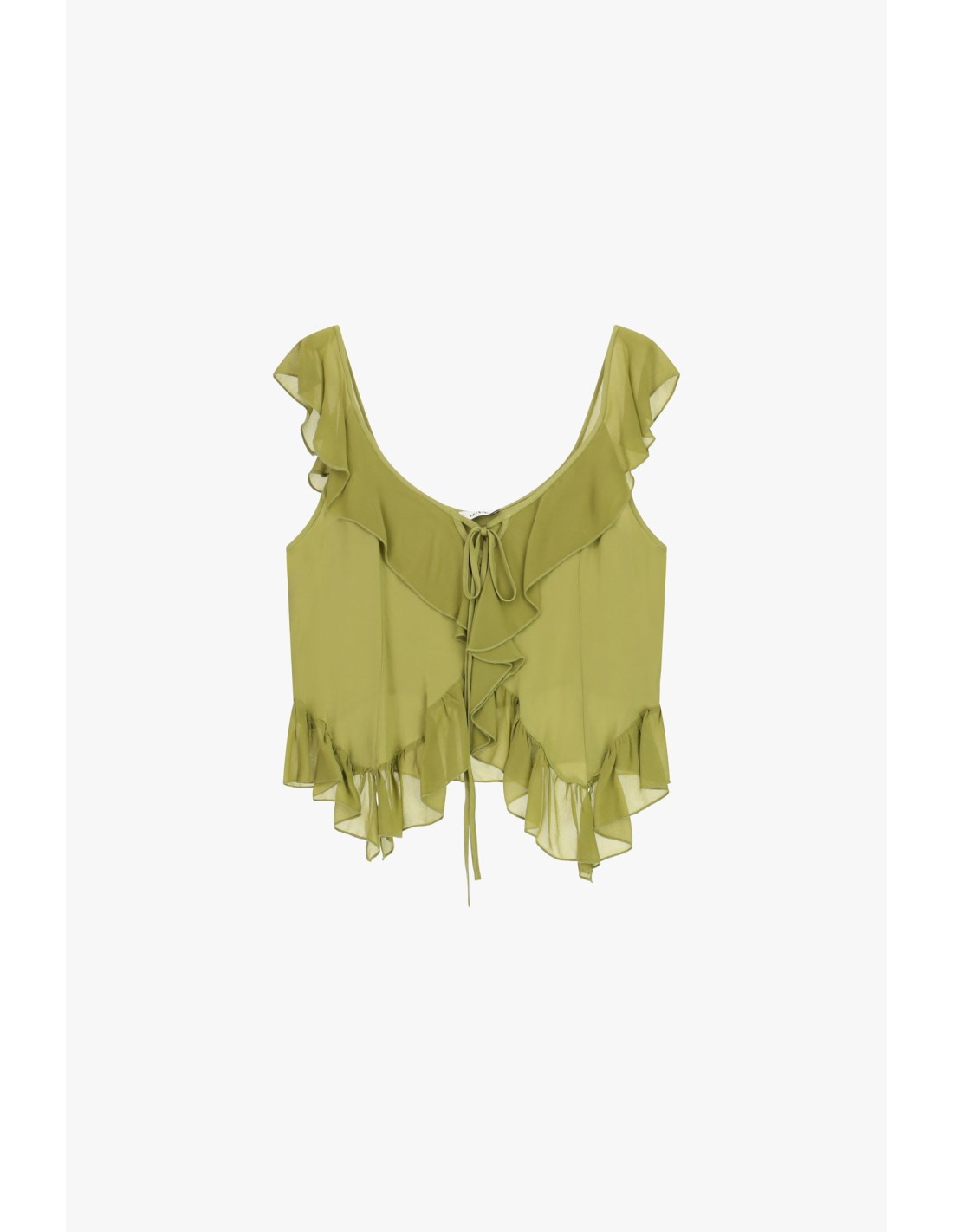 Este top joga com volumes suaves graças aos folhos leves que emolduram o decote e a barra, enquanto o decote amplo e o cordão atado à frente acrescentam um toque romântico. Perfeito para combinar com os teus jeans preferidos ou com uma saia para um look que torna cada dia especial, é uma escolha fresca e feminina.