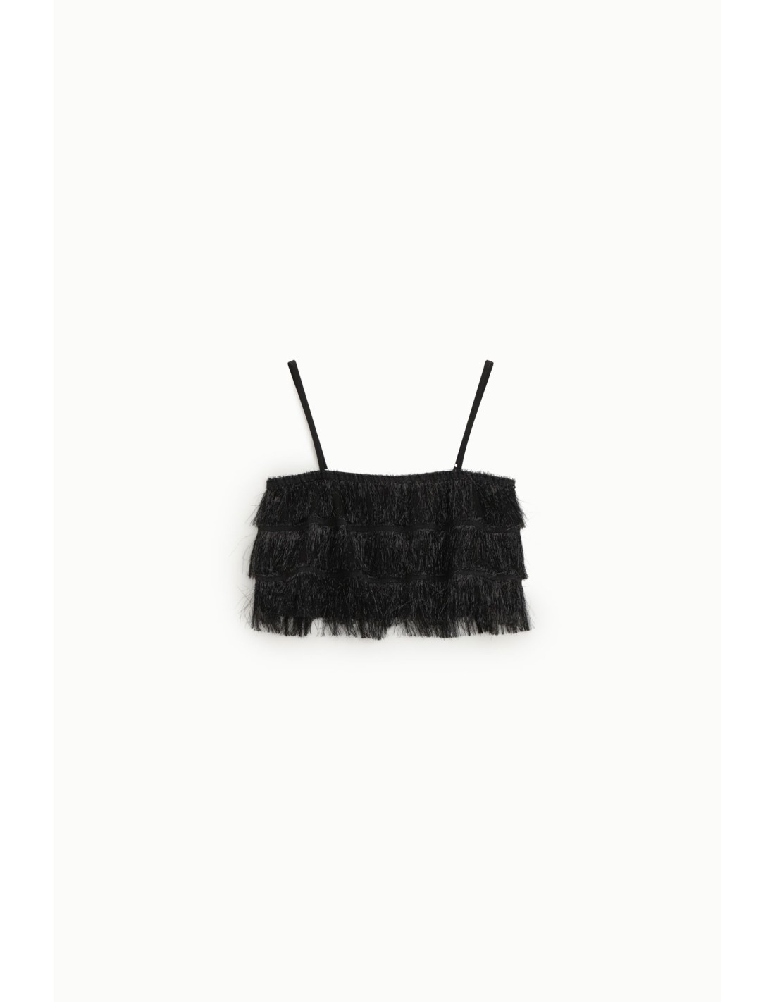 Deixa-te conquistar por este top com detalhes de franjas e alças finas, ideal para dar um toque original e feminino aos teus looks do dia a dia. A linha fluida valoriza a silhueta com leveza, enquanto os jogos de movimento acompanham cada um dos teus passos, perfeito para combinar quer com saias quer com calças.