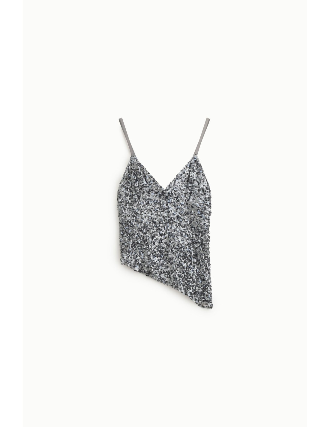 Concebido para quem gosta de se distinguir todos os dias, este top com lantejoulas oferece brilho e movimento. As alças finas e a linha assimétrica conferem um toque original. Fácil de vestir para ocasiões especiais ou para dar carácter ao look do dia a dia, imagina-te a brilhar em qualquer momento.