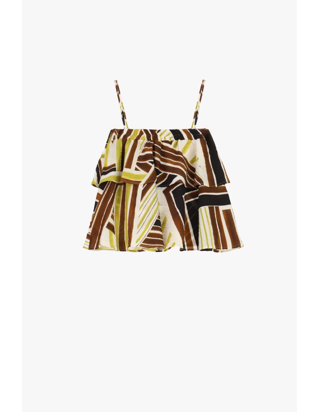 Super leve e esvoaçante, este top com alças finas e estampa geométrica traz energia a qualquer look. O corte largo e a silhueta arejada tornam-no perfeito para dias quentes e para sobreposições. Ideal para criar looks descontraídos mas cheios de personalidade, com um toque audacioso e pessoal.