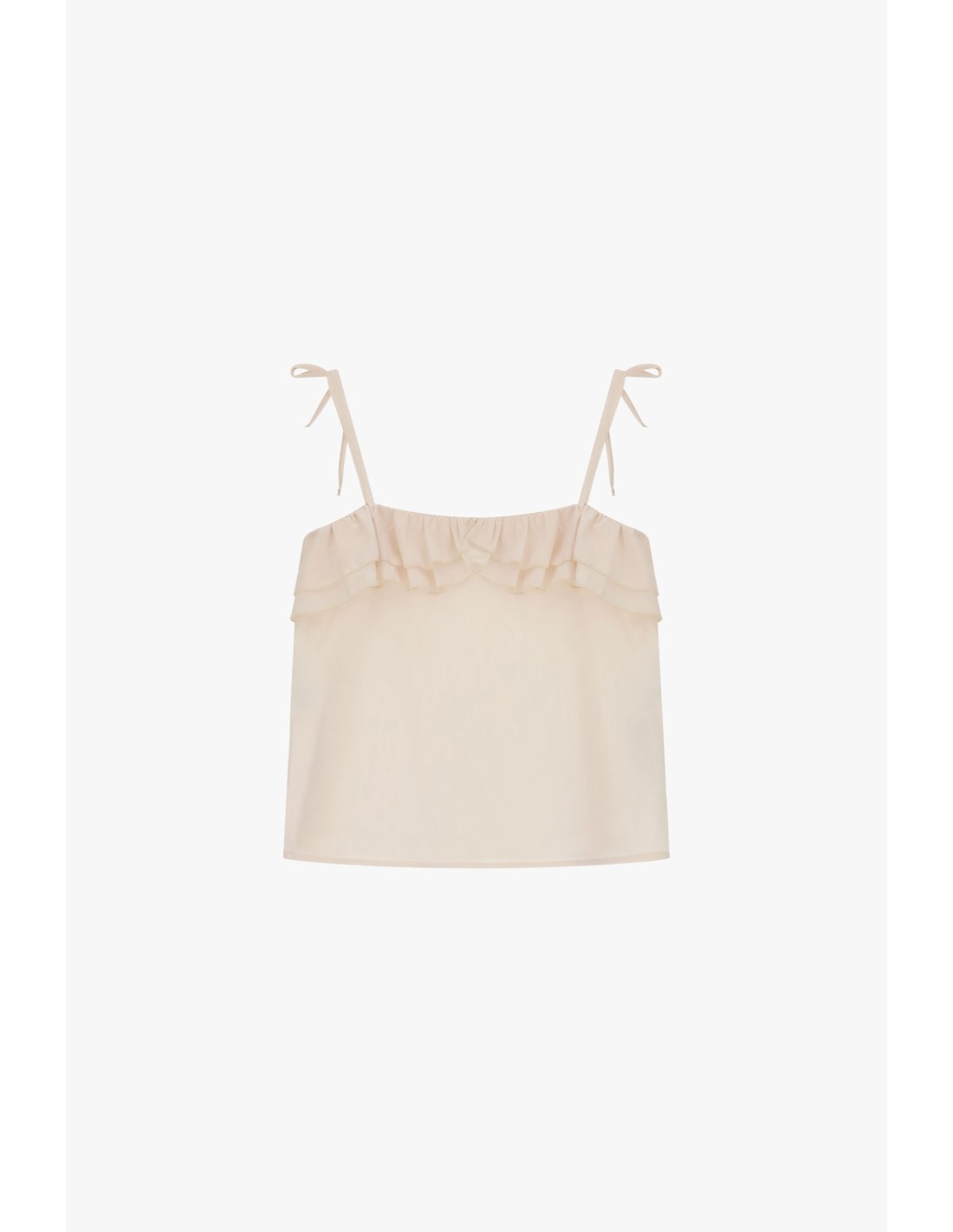 Este top de corte curto apresenta alças finas para atar nos ombros e um delicado folho na zona frontal. Perfeito para experimentar looks em camadas ou para o usar como peça principal com jeans ou saias, é ideal para dar um toque diferente e marcante ao look do dia a dia.