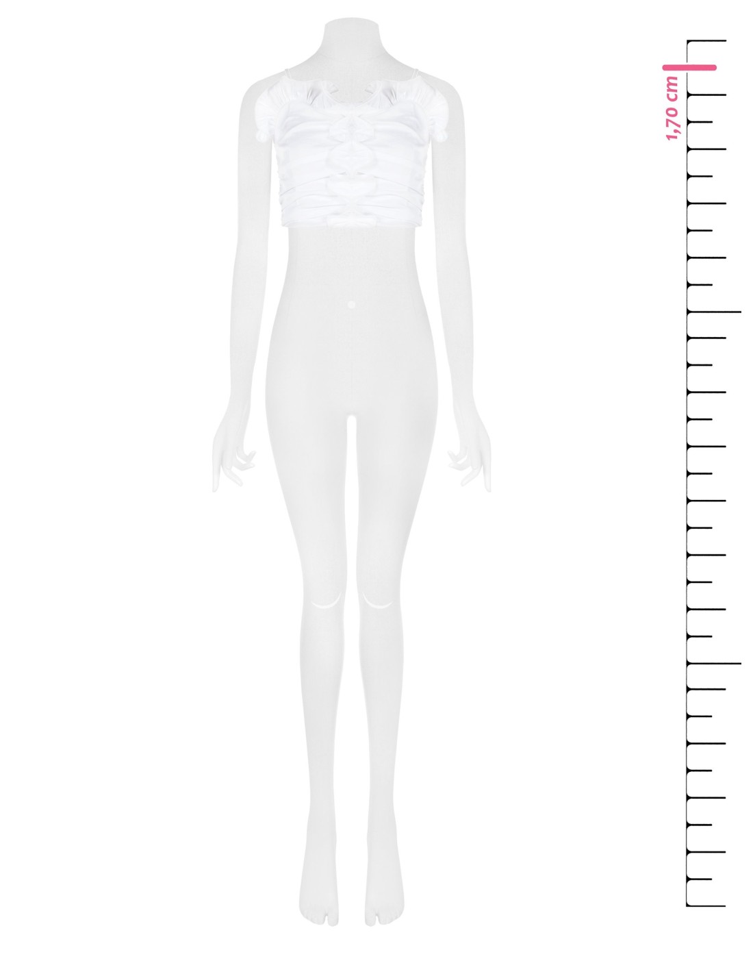 Crop top em mistura de algodão com textura fresca e leve, com corte justo e estruturado que valoriza a silhueta com conforto. O decote franzido e os folhos frontais acrescentam feminilidade, enquanto o fecho de correr nas costas garante praticidade. Perfeito para festas, jantares e looks do dia a dia requintados.