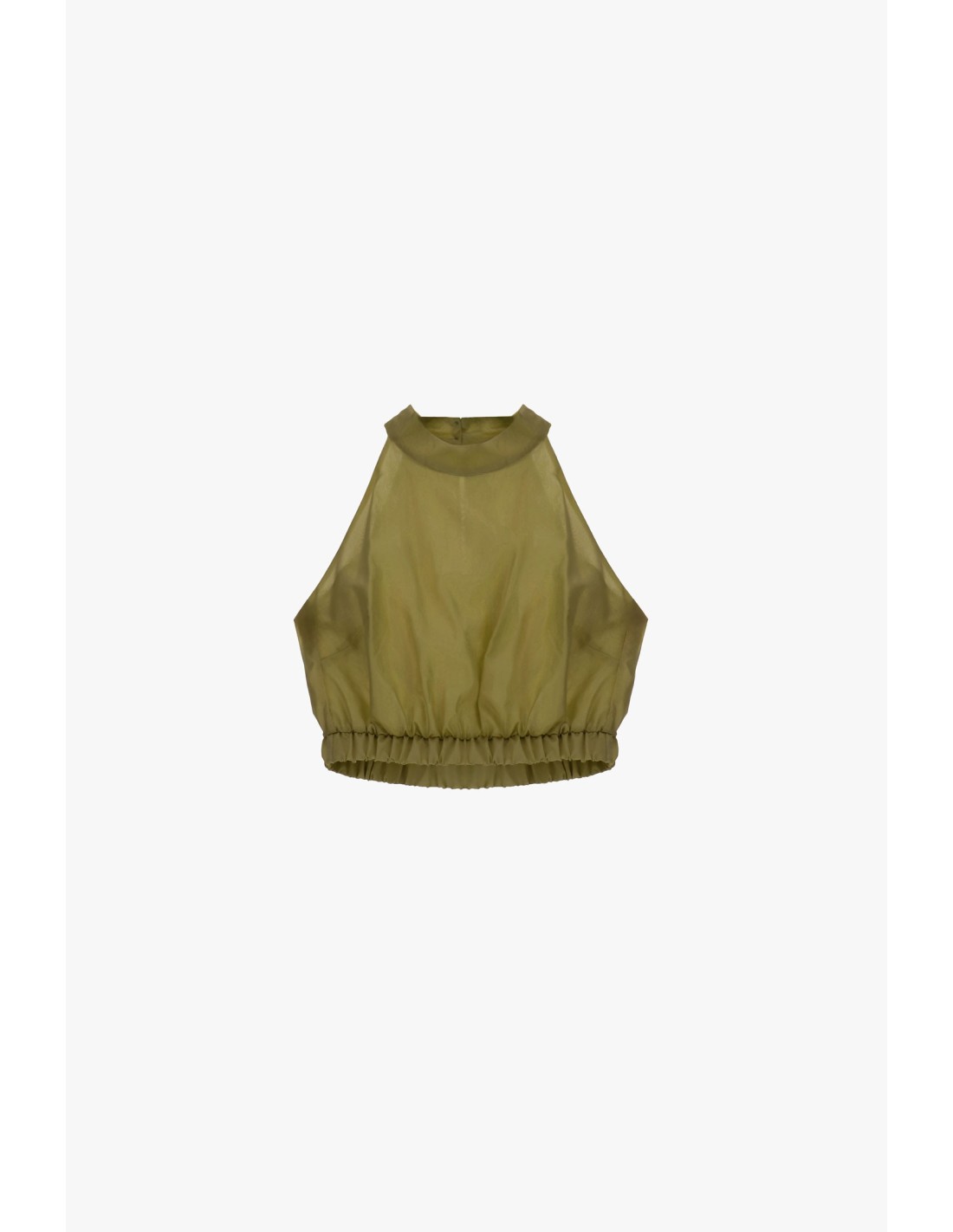 Um top curto sem mangas com decote alto arredondado e corte amplo, franzido na cintura para realçar a silhueta. Perfeito para valorizar qualquer look com leveza e estilo, combina facilmente com calças ou saias e acompanha-te com um toque original tanto em saídas informais como em ocasiões especiais.
