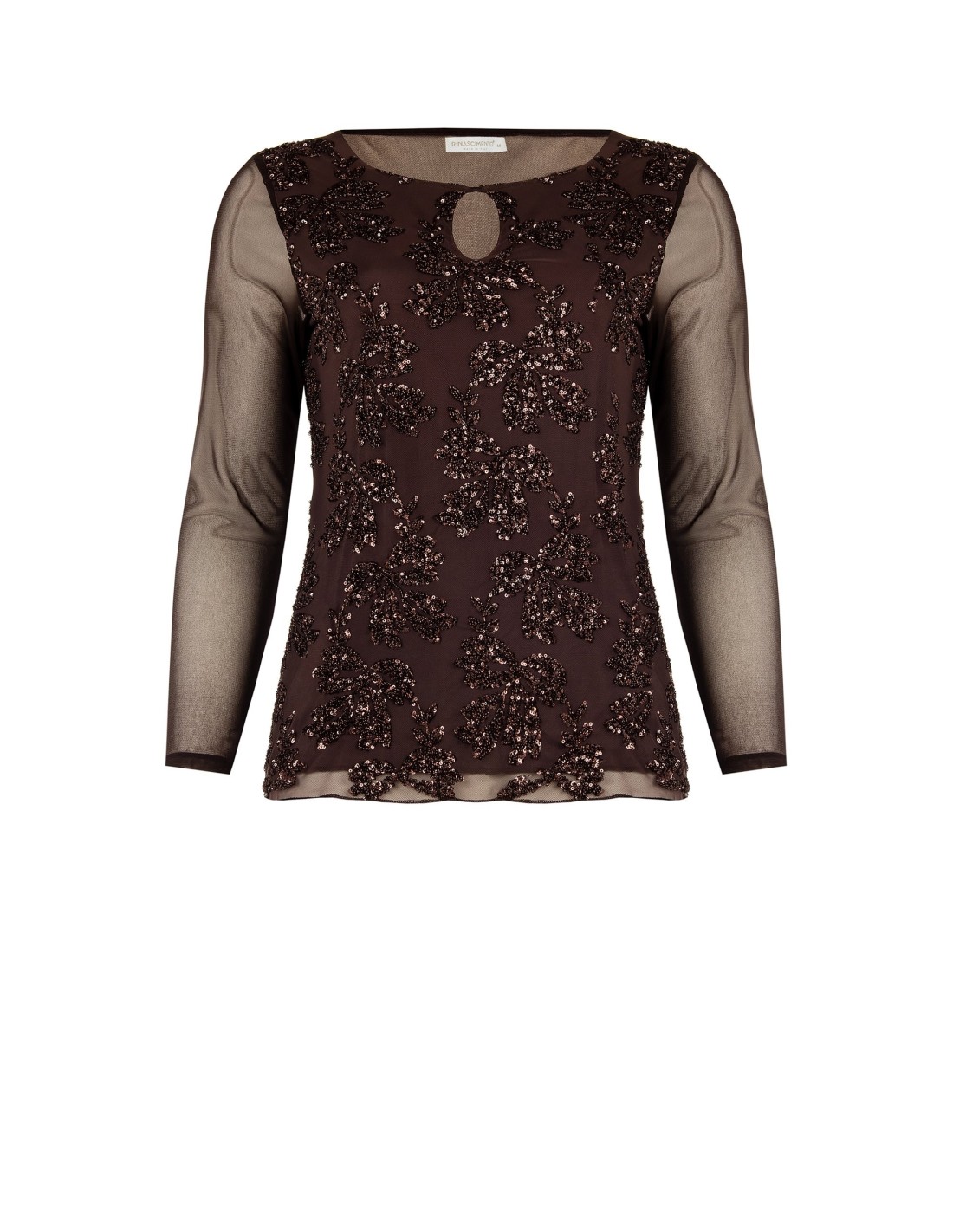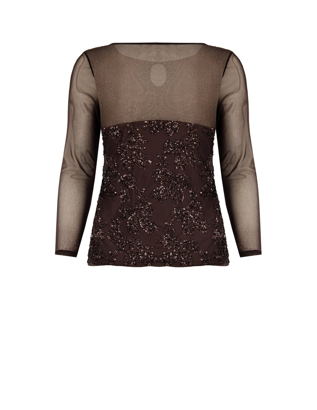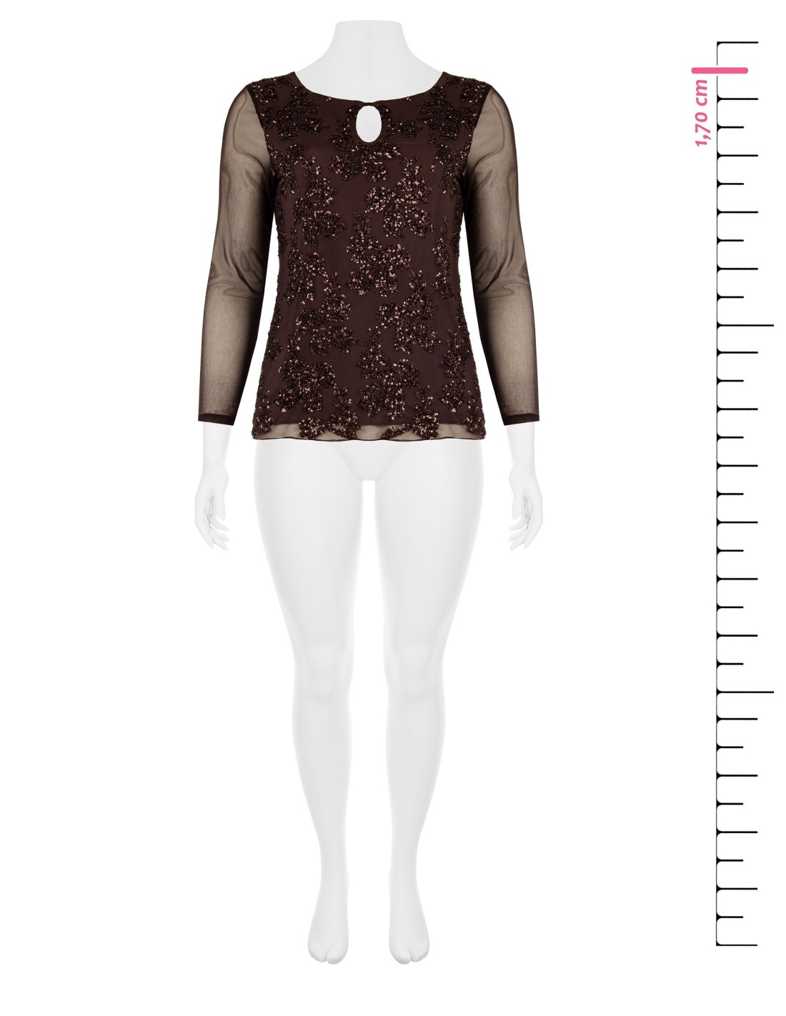 Top curvy de manga longa, corte justo que valoriza a silhueta sem apertar. Tule leve com bordados florais de paetês sobre base macia. Detalhe em abertura "keyhole" no decote e mangas transparentes. Perfeito para festas e jantares, combina com calças fluidas ou saias lápis para um efeito refinado.