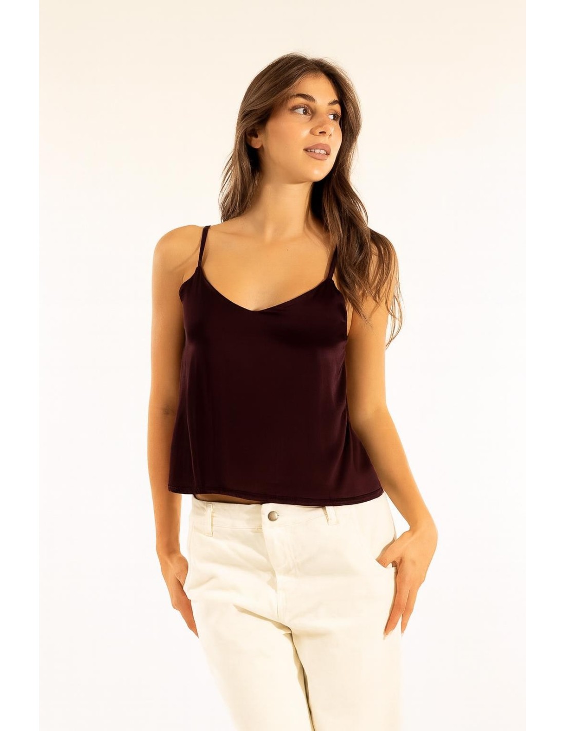 Kontatto assina um top leve com corte solto e fluido que valoriza a silhueta. Cetim com efeito seda, toque fresco e fluido. Decote em V feminino e alças reguláveis para um ajuste sob medida. Perfeito por baixo de blazer no escritório, com denim para o dia a dia ou com acessórios luminosos para a noite.