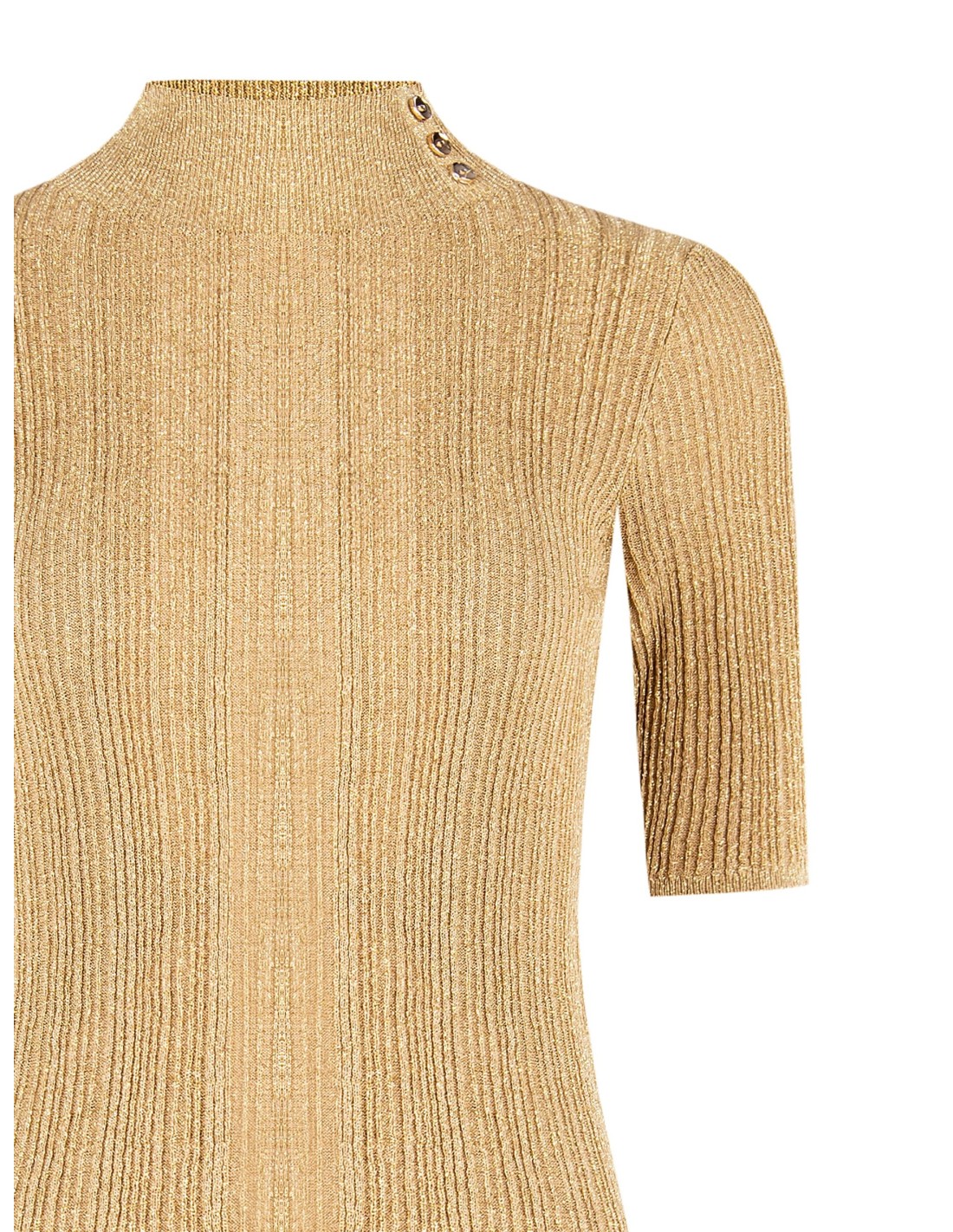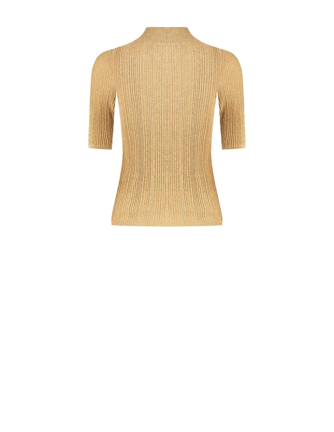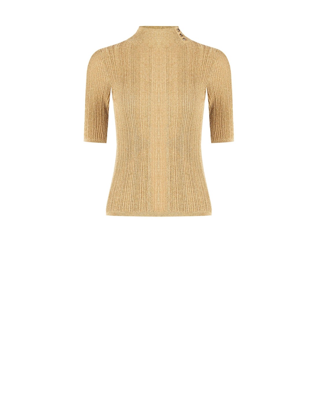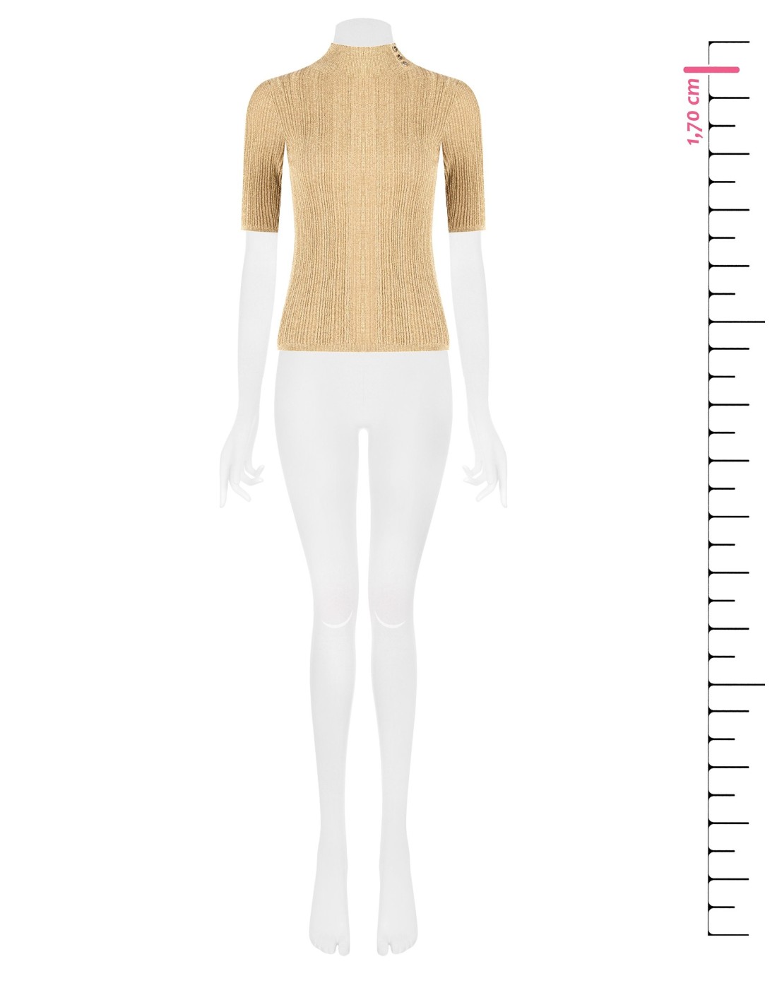 Top de mangas curtas com um corte justo que modela com conforto. Malha canelada em fio macio com toques luminosos, agradável na pele. Gola alta minimal com três micro botões joia e ombro liso. Perfeita por baixo de um blazer no escritório ou com denim e saia para o aperitivo. Marca: Rinascimento.
