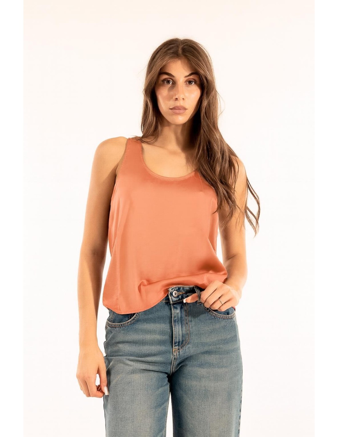 Top Kontatto com corte suave que acaricia a silhueta sem marcar. Tecido cetim com toque fluido e ligeiro brilho para um conforto fresco ao longo do dia. Decote redondo limpo e bordos rematados tom sobre tom. Perfeito por baixo de blazer no escritório, com denim para o dia a dia ou com joias para a noite.