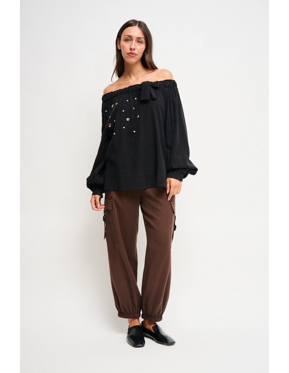 Blusa Maryley de corte macio e fluido, em viscose leve que acaricia a pele. Decote off-shoulder com elástico e laço lateral para regular o caimento; mangas amplas com punho. Aplicações luminosas na frente. Perfeita com denim ou tailoring para escritório, aperitivo e festa.