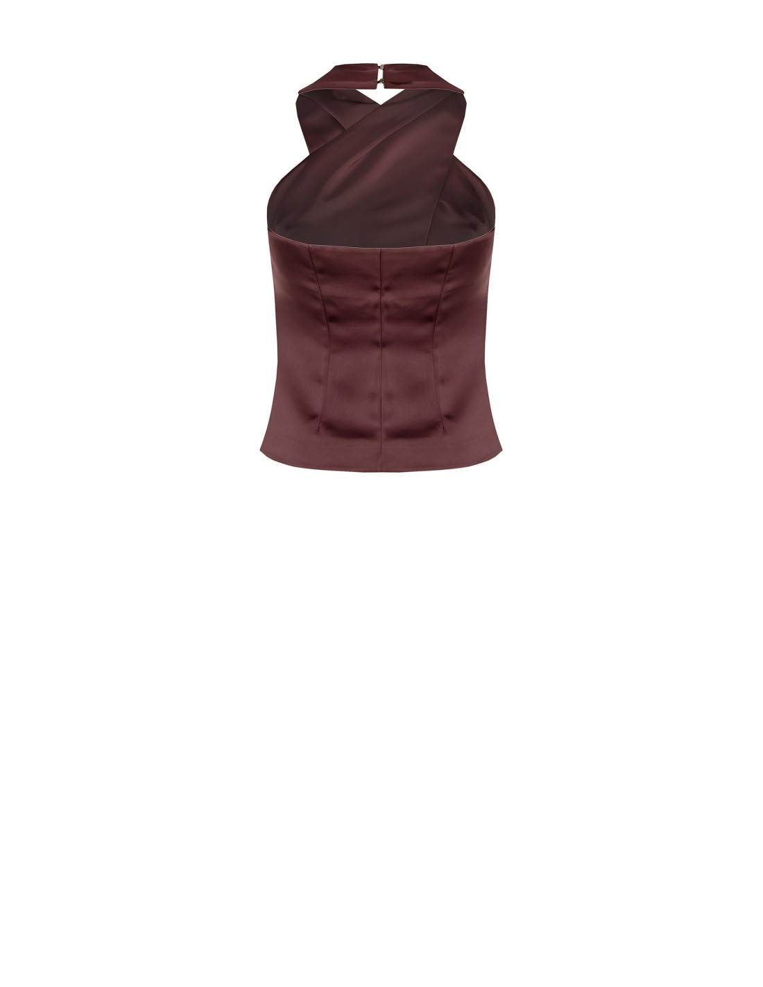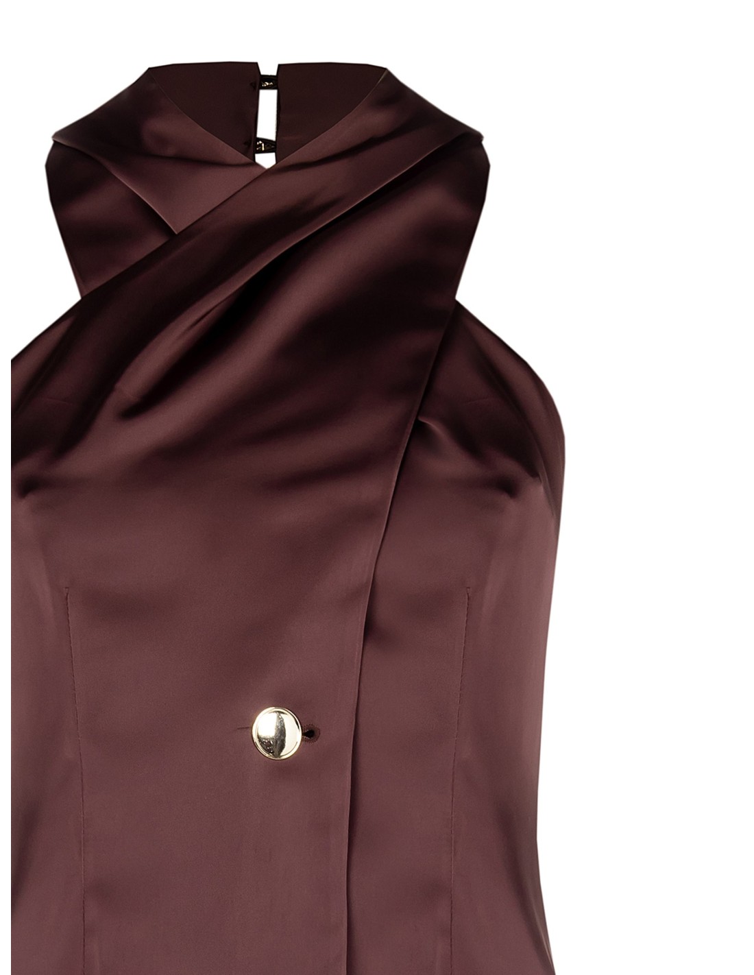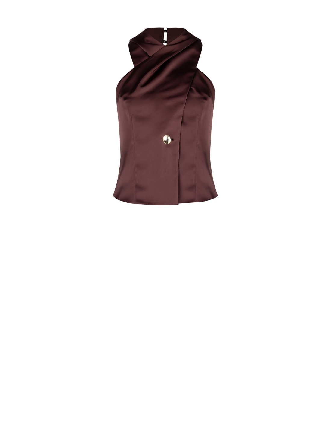 Blusa sem mangas de corte justo, em tecido acetinado com toque liso e luminoso, que valoriza a silhueta com conforto. O design cruzado no decote e a gola alta com botão joia acrescentam caráter. Perfeita para escritório, jantar ou festa.