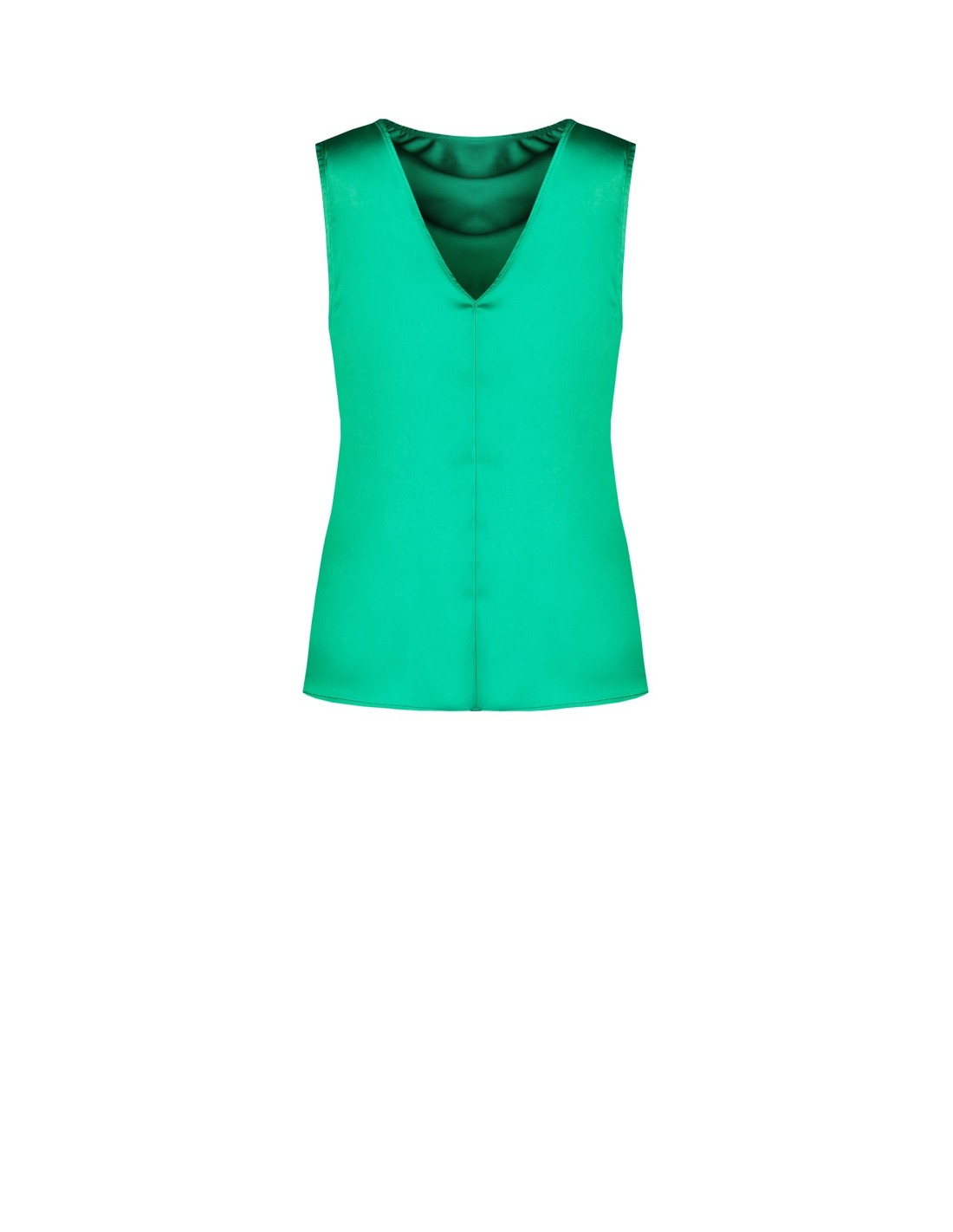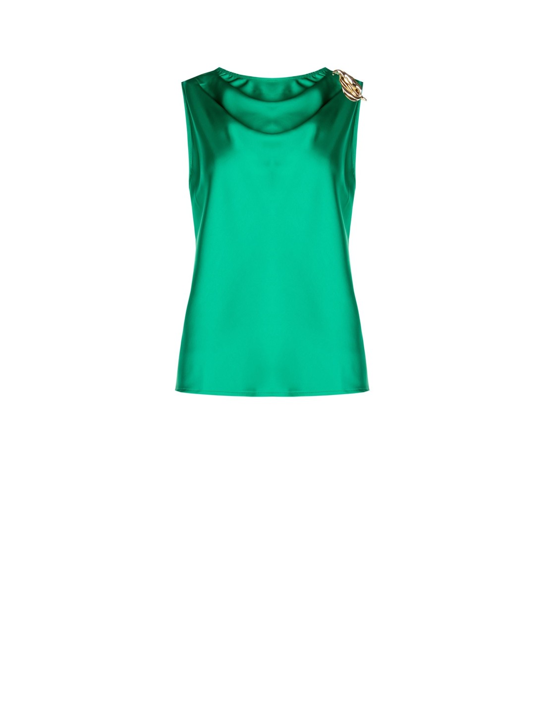Blusa sem mangas com ajuste macio, em cetim fluido e luminoso que acaricia a silhueta com conforto. O drapeado no decote e o broche joia no ombro acrescentam carácter com discrição. Perfeita para o escritório, um aperitivo ou um jantar especial.