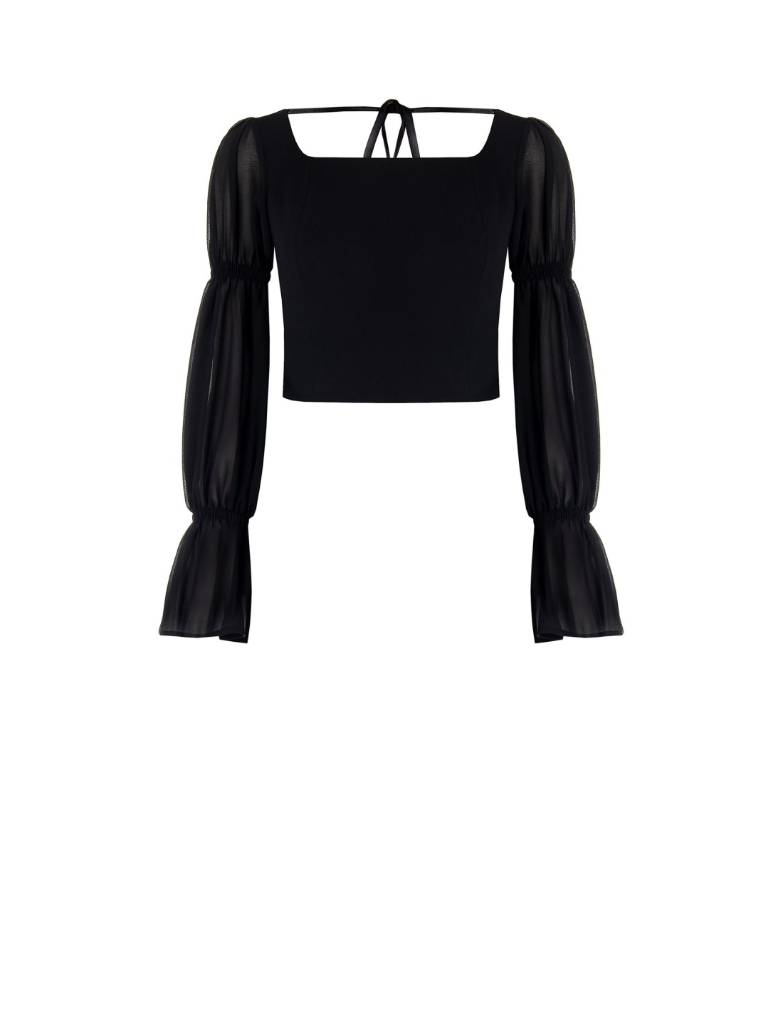Top Rinascimento com corte justo que realça a cintura. Corpo em scuba crepe elástico para conforto e sustentação, mangas balão em georgette leve. Decote reto com cordões na parte de trás e fecho invisível. Versátil para a noite: perfeito com calças de cintura alta para festas, cocktail ou encontros românticos.