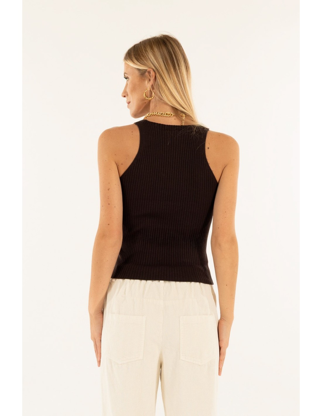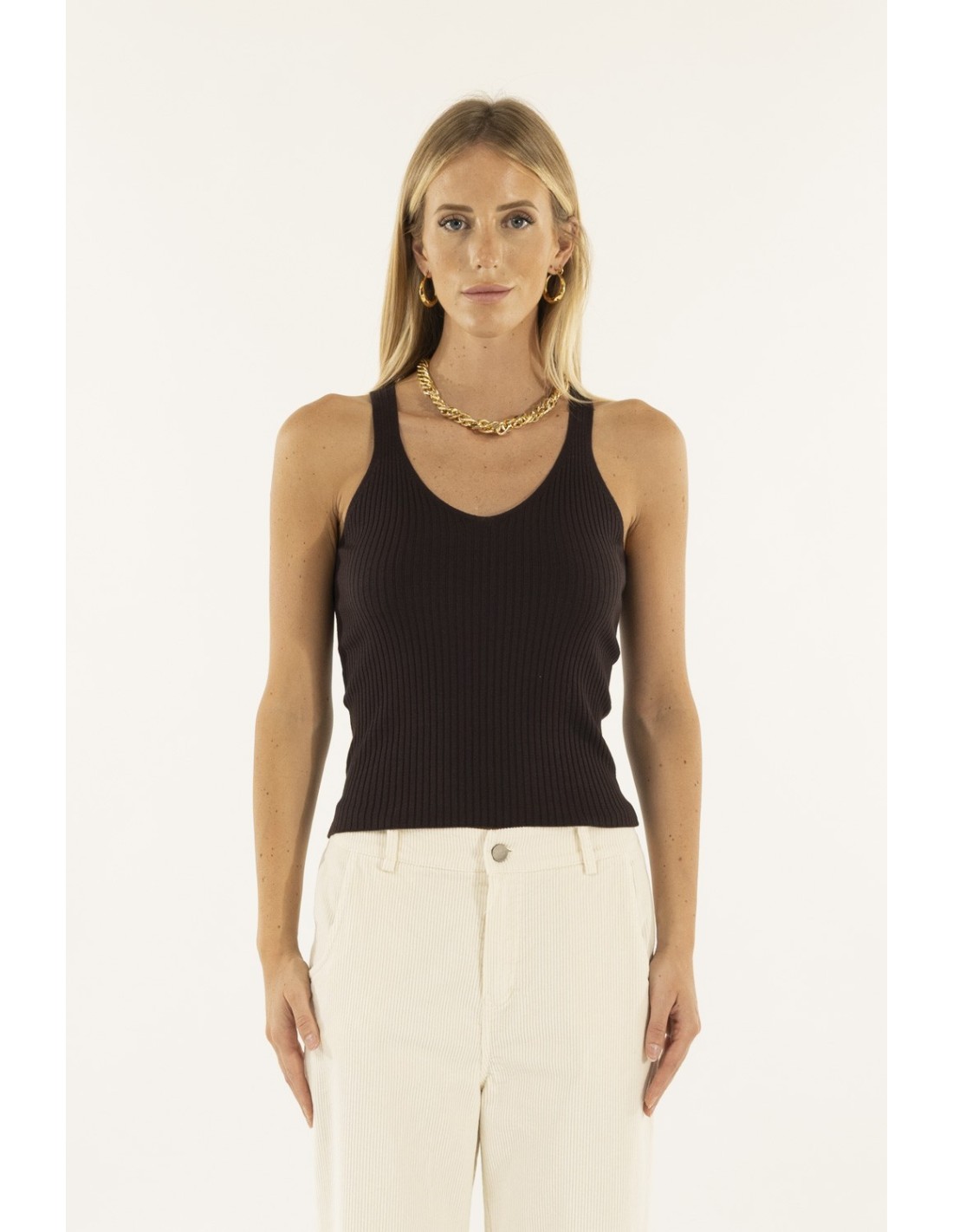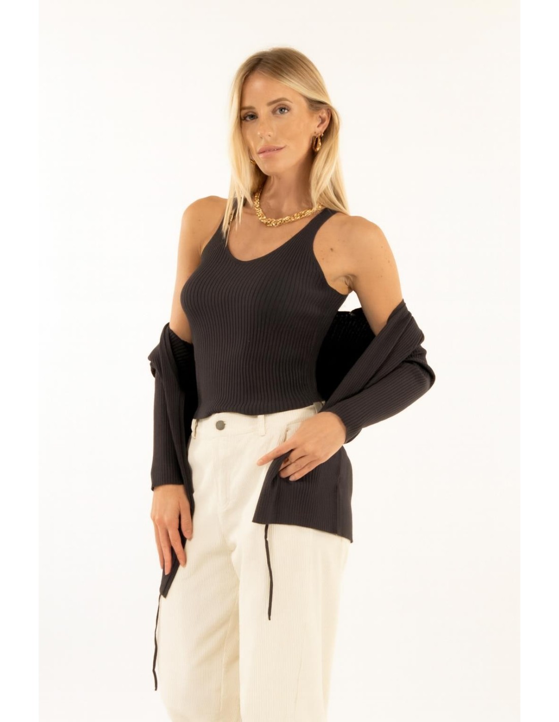 Kontatto assina uma camisola de alças ajustada que esculpe a silhueta com malha canelada elástica, suave contra a pele. O decote em V feminino e as alças nas costas em forma de "racer" realçam os ombros e o decote. Versátil por si só ou sob um blazer: perfeito para o quotidiano requintado e o escritório informal.