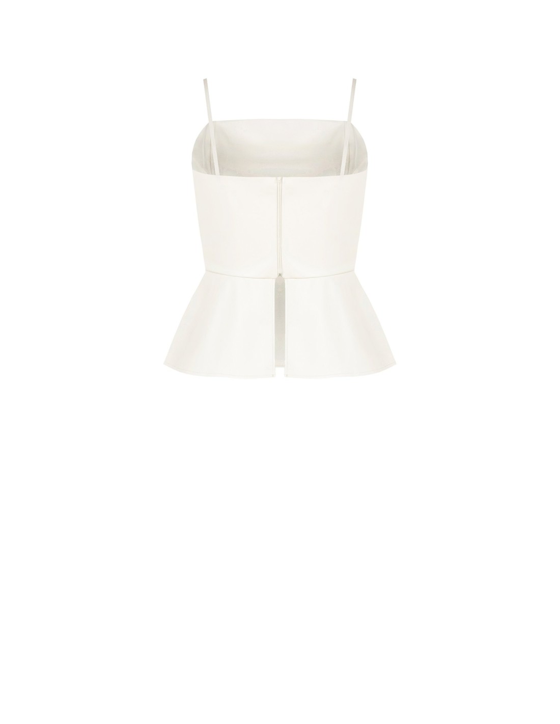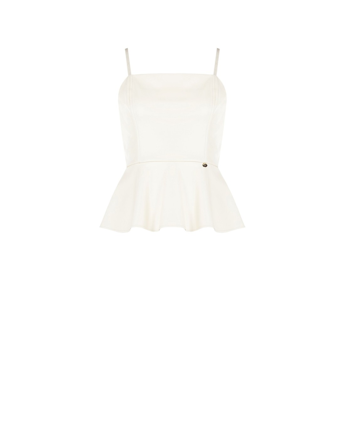 Top evasê com ajuste justo ao busto e peplum que define a cintura. Confeccionado em suave pele sintética com efeito liso, oferece estrutura sem renunciar ao conforto. Alças finas, decote recto e fecho atrás com zip para um ajuste limpo. Perfeito para o escritório com blazer e à noite com calças skinny ou saia.