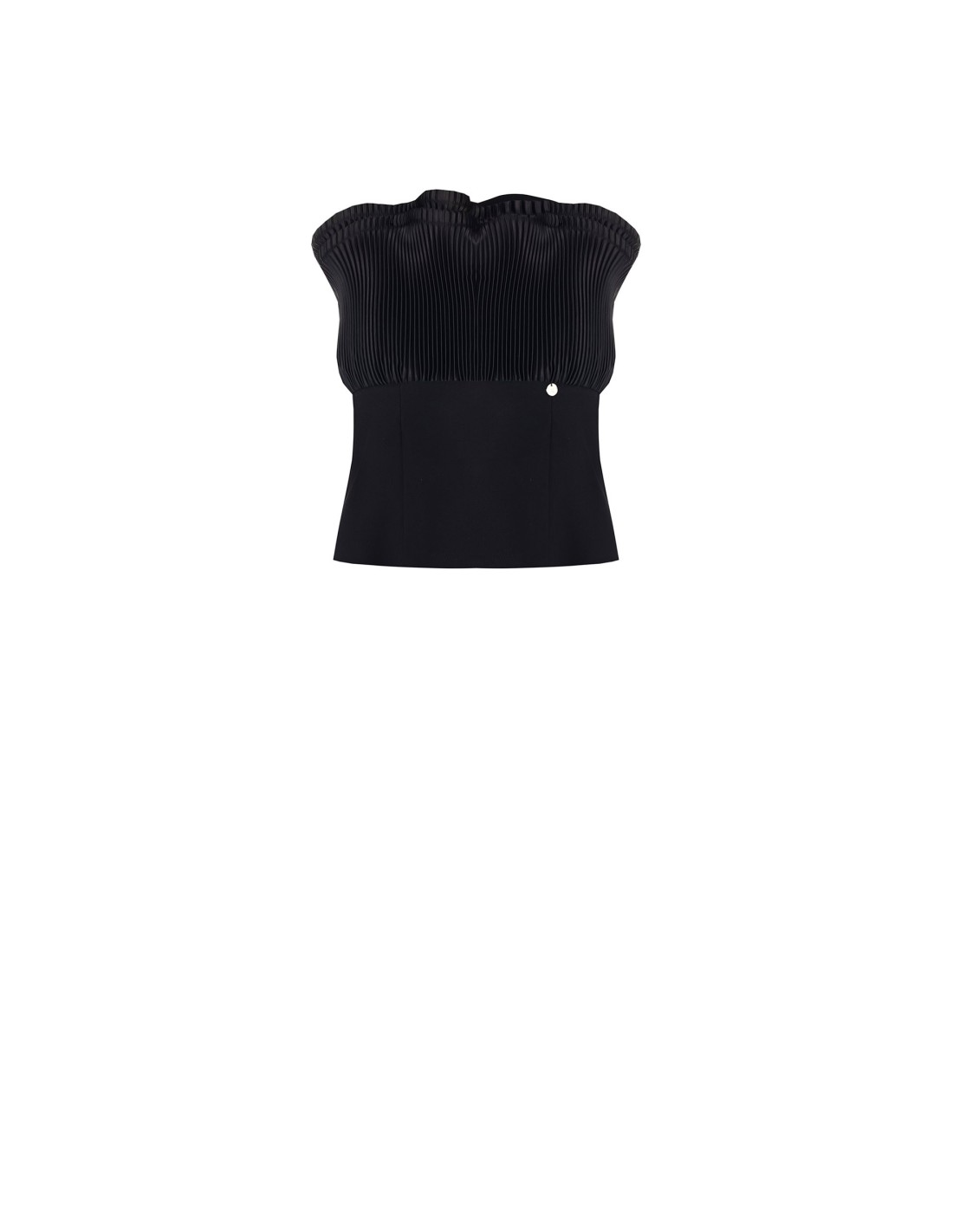 Bustier de corte ajustado que valoriza a silhueta com conforto e suporte. O corpete combina textura plissada e tecido compacto para um ajuste limpo e feminino. Decote reto com borda ondulada e pequeno pendente metálico: perfeito do aperitivo à festa, com blazer ou calças de alfaiataria.
