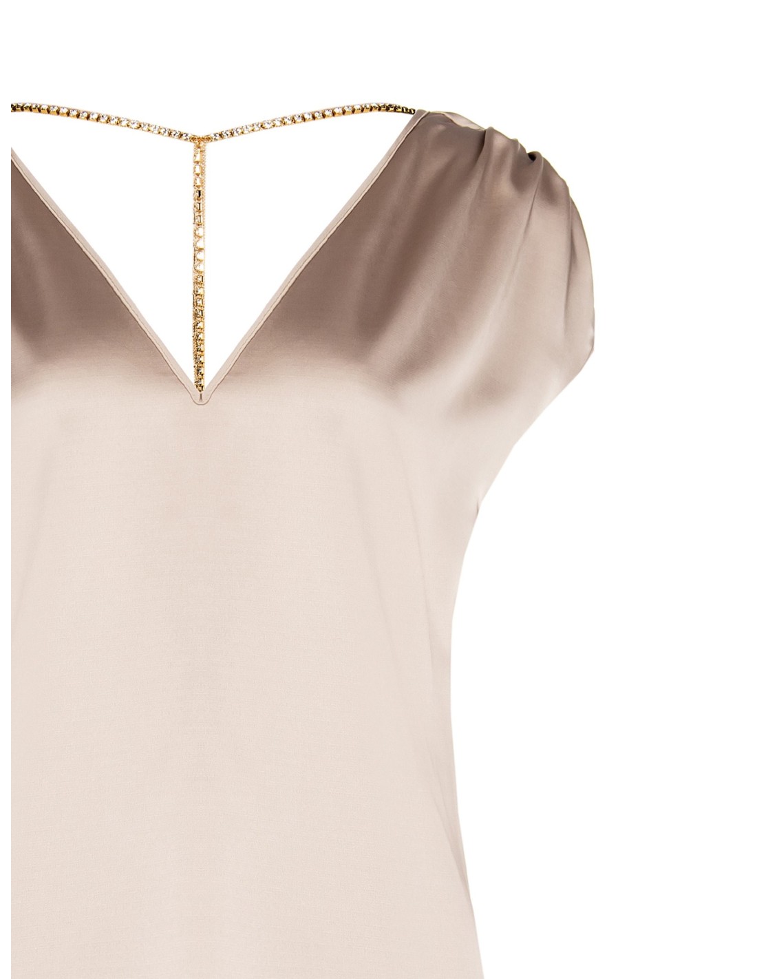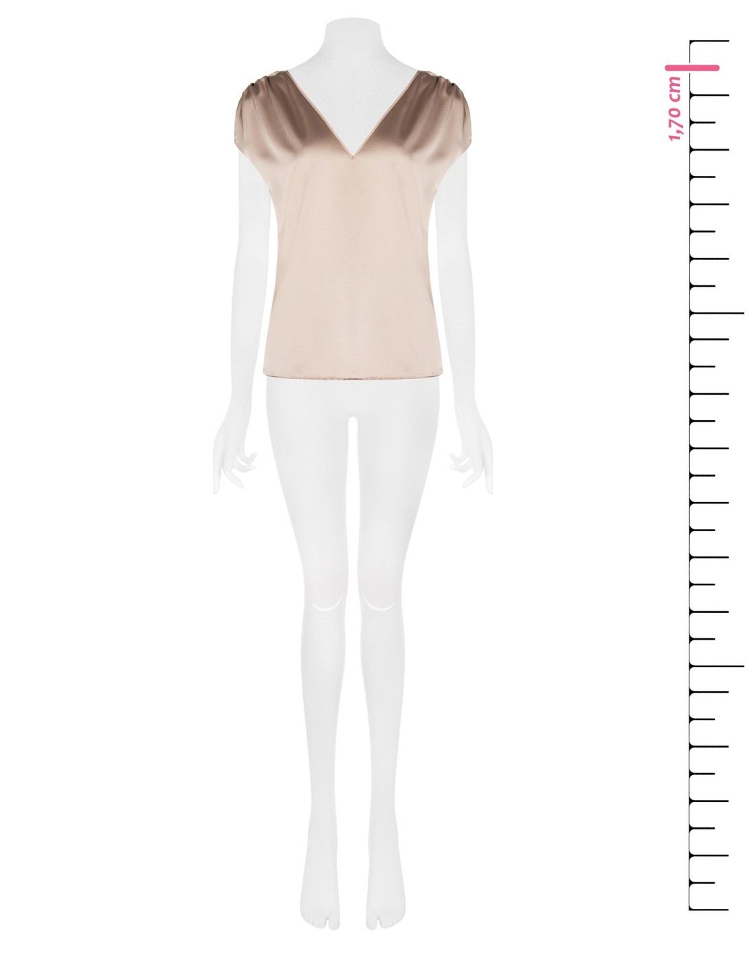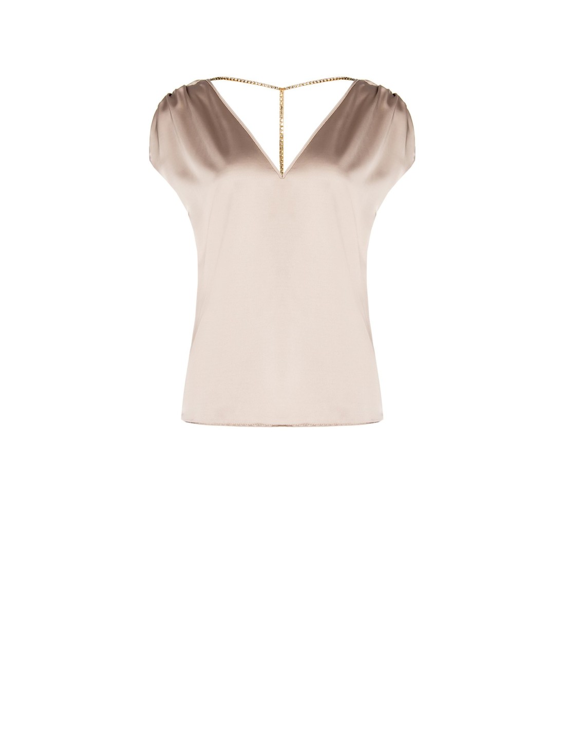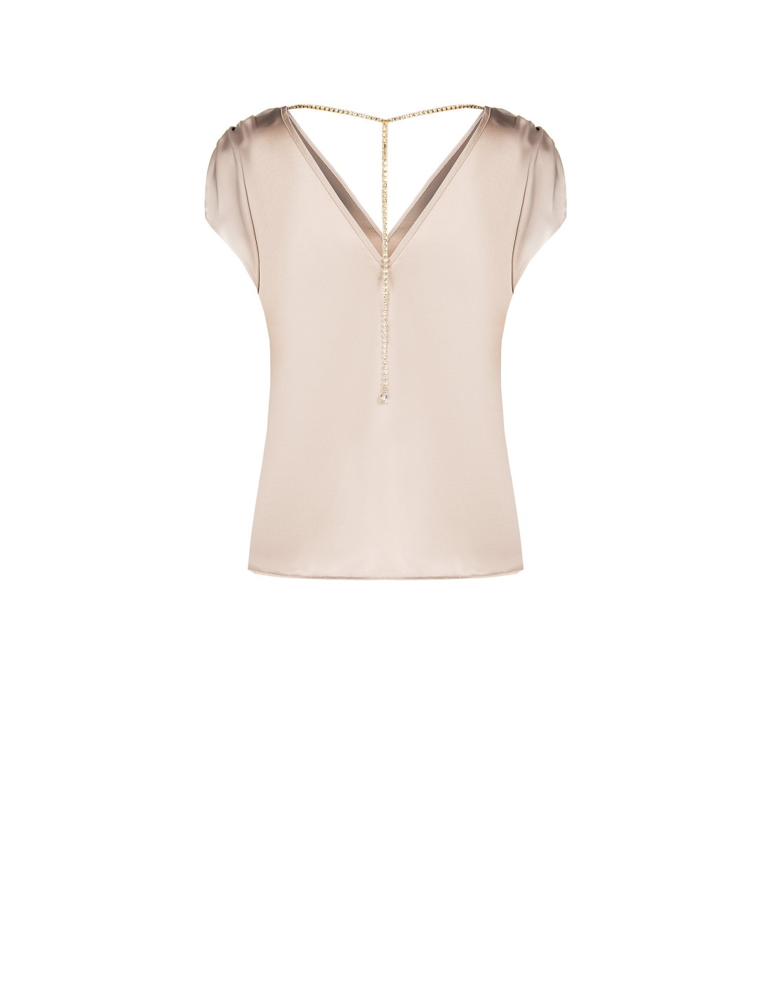 Blusa em cetim fluido de corte suave que desliza pelo corpo, com mangas leves franzidas. Decote em V à frente e atrás, adornado por corrente-jóia com pérolas nas costas. Perfeita com calças ou saias de cintura alta, do escritório ao aperitivo.