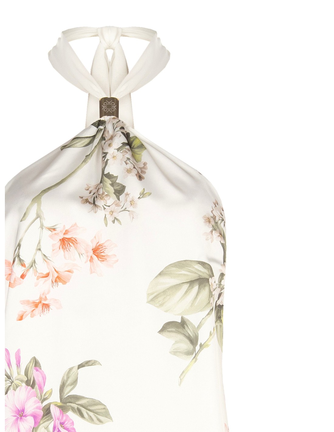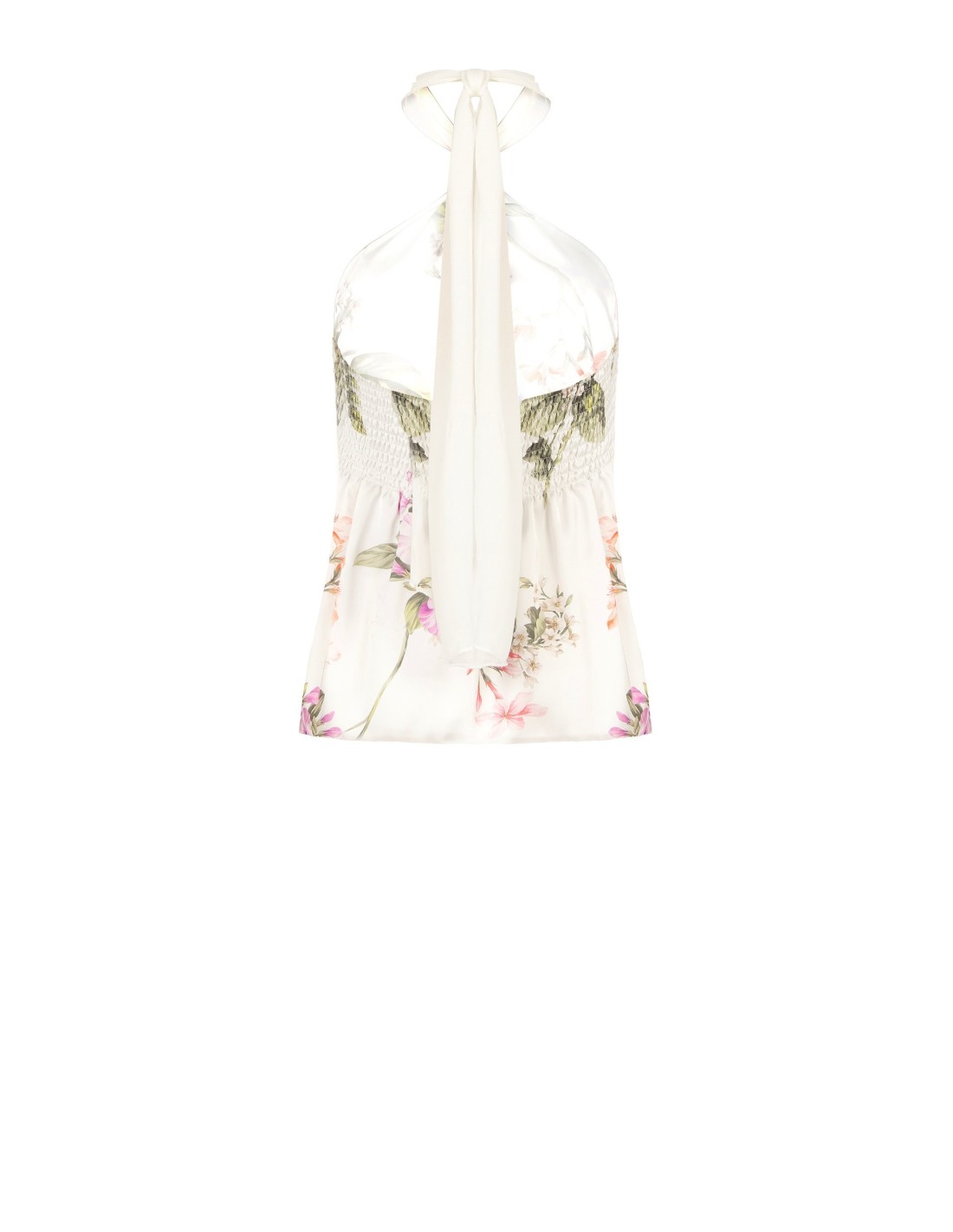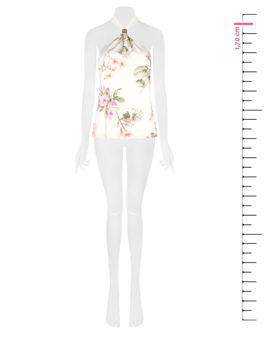 Blusa sem mangas com corte fluido que acaricia a silhueta com leveza. O tecido acetinado e a estampa floral conferem uma elegância fresca, enquanto o decote americano com detalhe de joia e as costas com elástico asseguram conforto e um ajuste versátil, perfeita para o dia ou para um jantar.