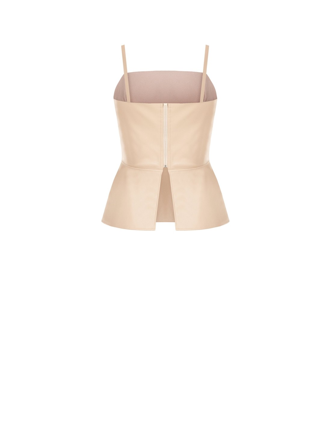 Corset moderno em suave eco‑pele, justo no busto e ligeiramente mais amplo na base para realçar a silhueta. Alças finas, decote recto e fecho nas costas com pequena abertura. Perfeito com calças ou saias de cintura alta para aperitivos e saídas à noite.