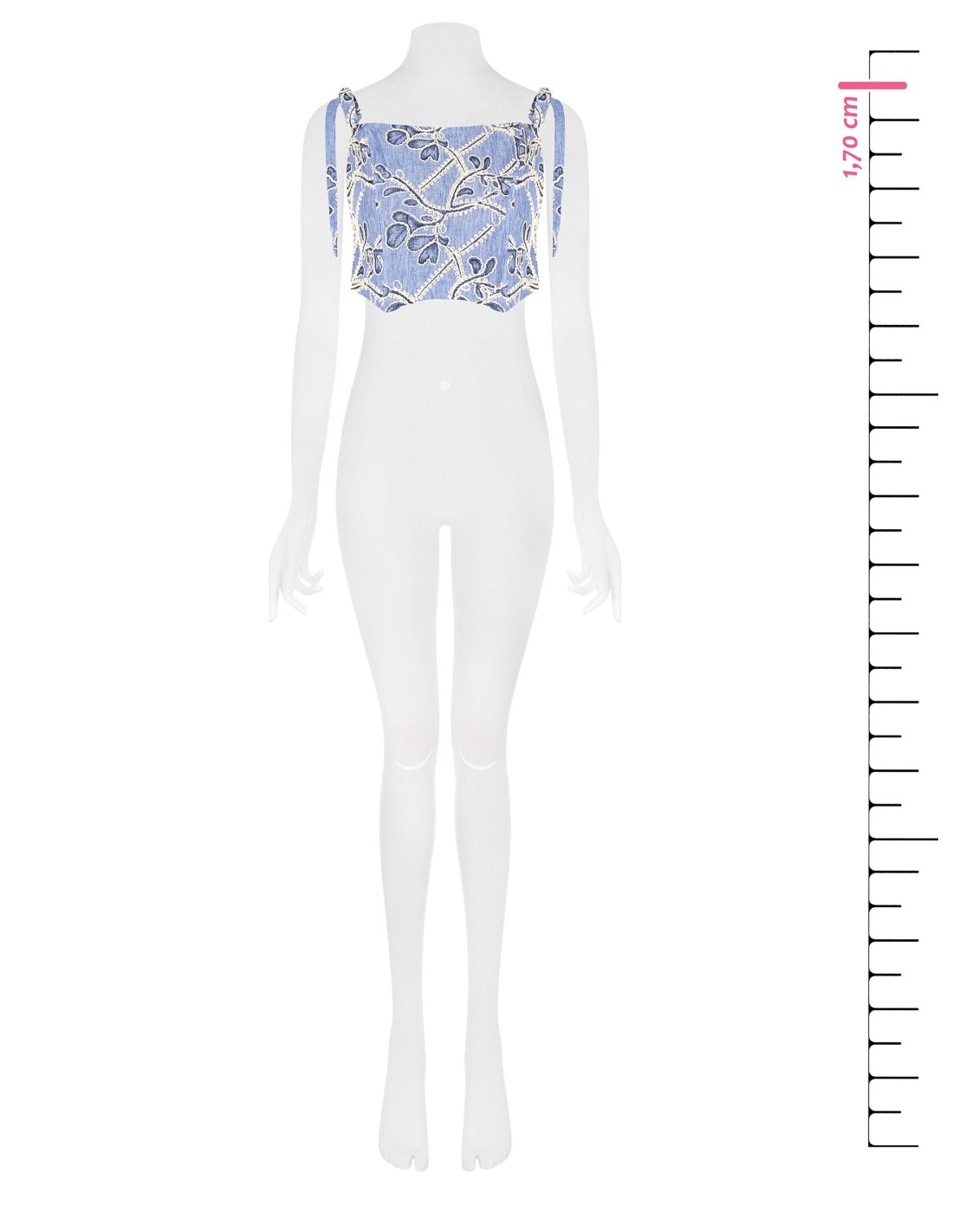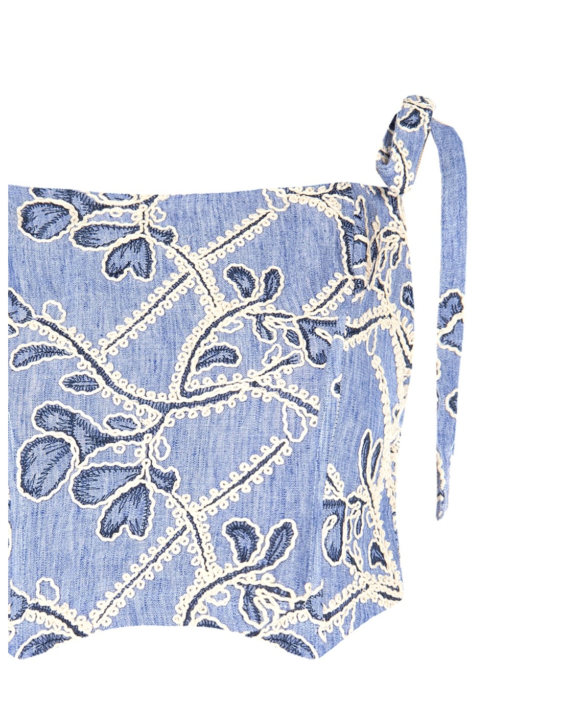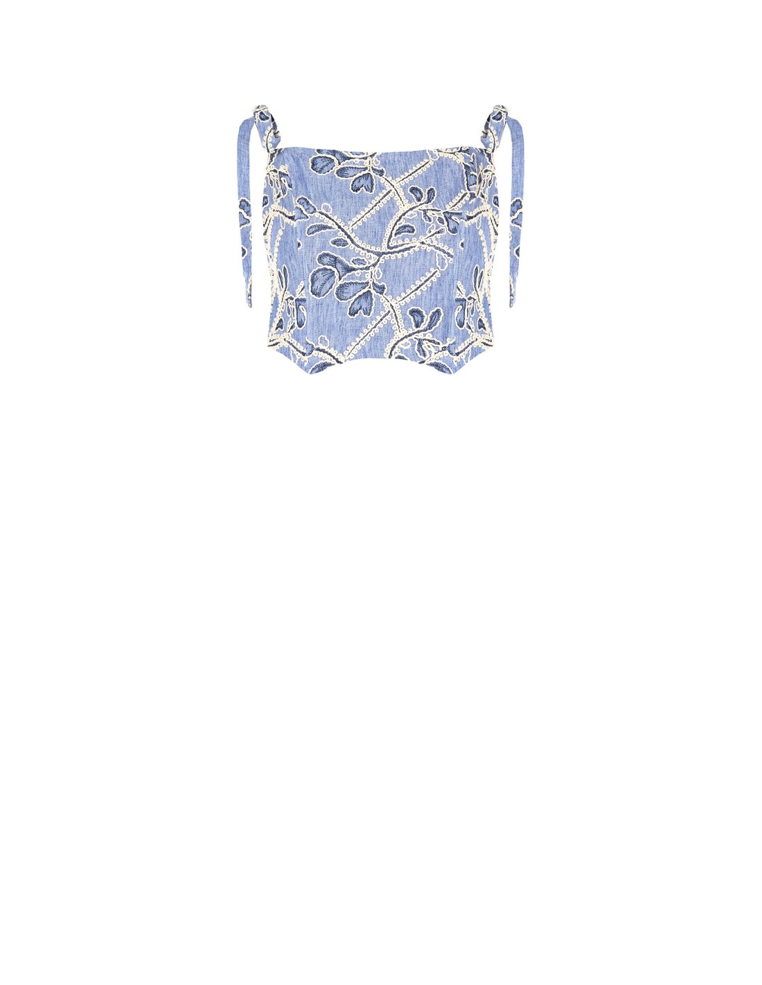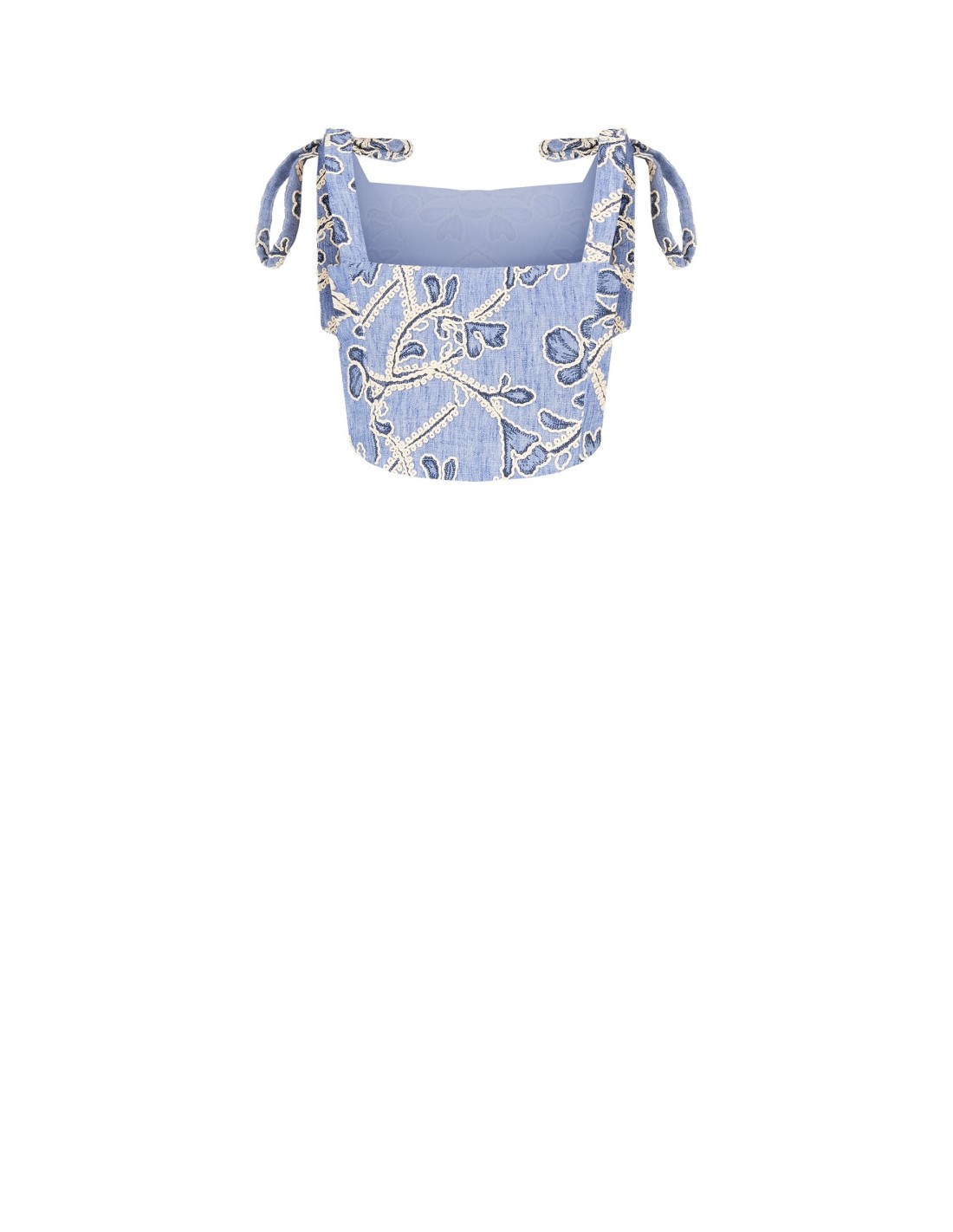 Bustier cropped de corte justo que valoriza a silhueta com conforto. O tecido leve com efeito ganga é enriquecido com bordados florais em relevo; o decote direito e as alças com laços adicionam um toque feminino. Perfeito para festas, aperitivos e looks quotidianos cuidados.