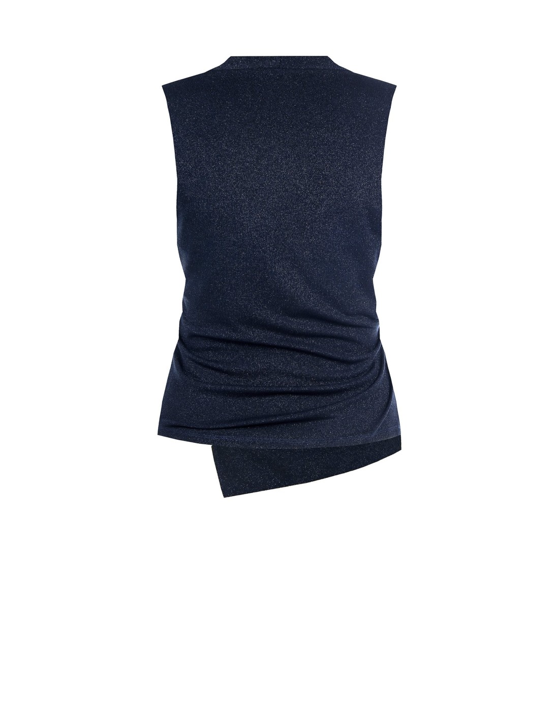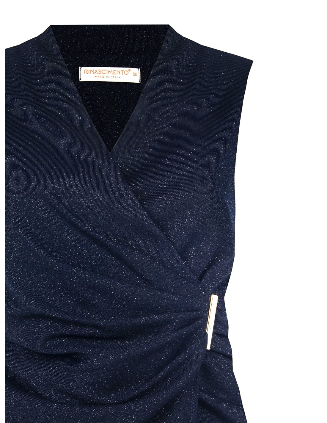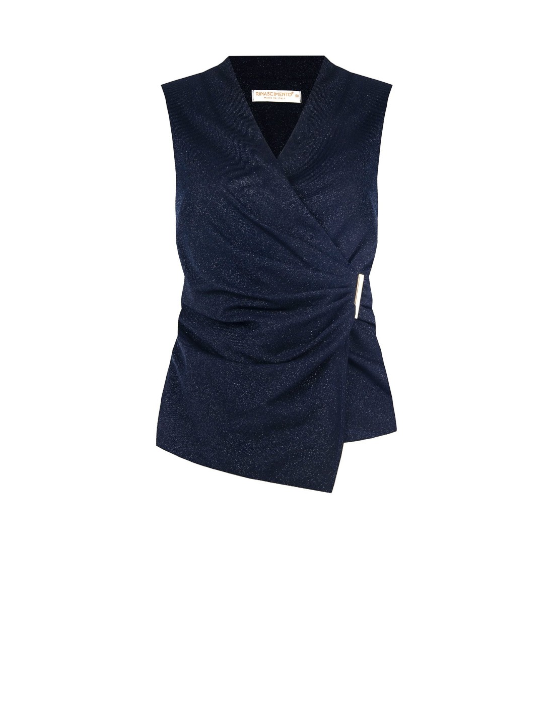 Blusa sem mangas de corte suave e feminino, em tecido luminoso com textura ligeiramente elástica que acompanha a silhueta com conforto. O decote em V, o drapeado cruzado e o detalhe metálico lateral tornam-na ideal para festas, jantares e eventos especiais.
