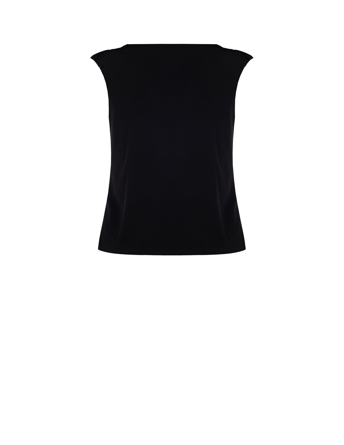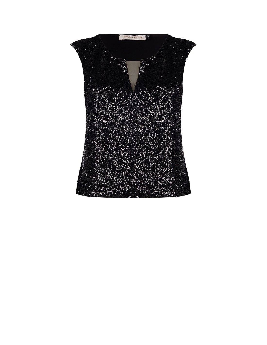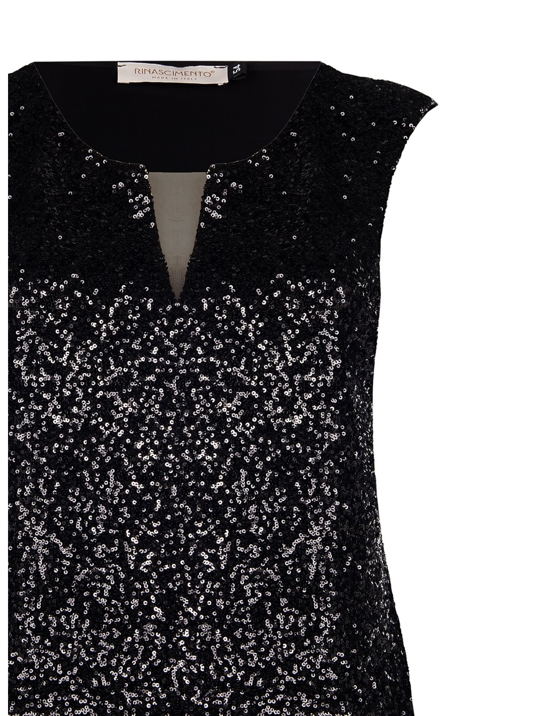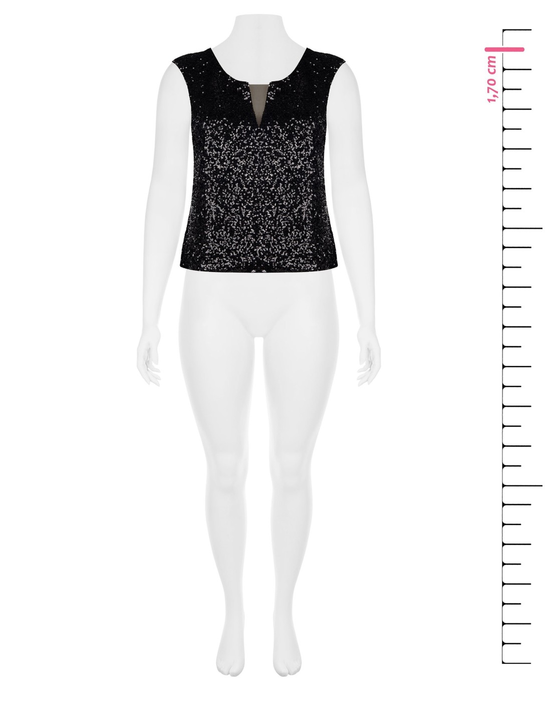 Top sem mangas de corte fluido, pensado para valorizar a silhueta com conforto. A frente bordada com lantejoulas cria uma textura luminosa, enquanto as costas em tecido stretch garantem uma vestibilidade agradável. Decote em V com aplicação em tule, perfeita para festas, cerimónias e noites especiais.