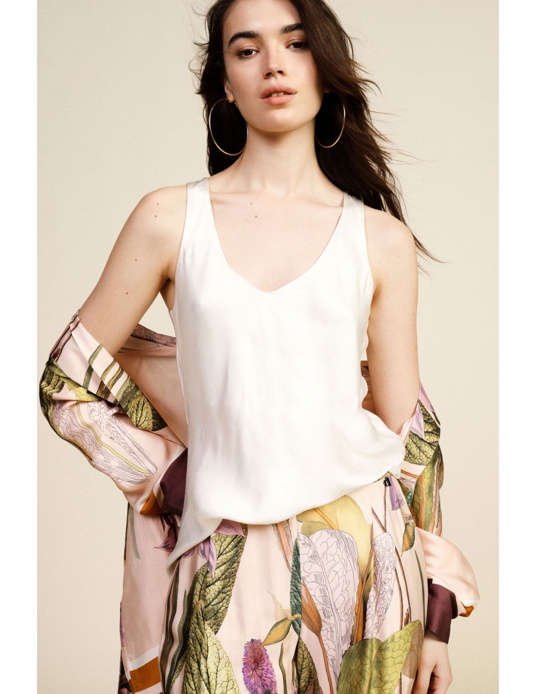 Um top de corte evasê e decote em V que se adapta perfeitamente a qualquer momento do dia. As alças largas e a bainha ligeiramente ondulada conferem um toque original, perfeito tanto por baixo de um casaco como combinado com uns jeans ou uma saia. Fácil de vestir, é a peça que resolve qualquer look com simplicidade e feminilidade.