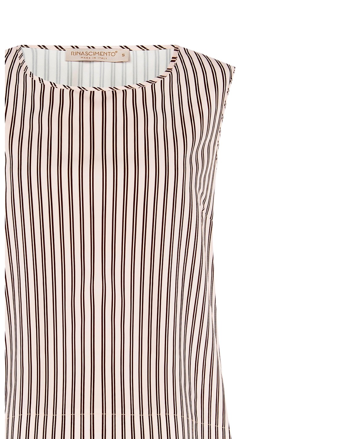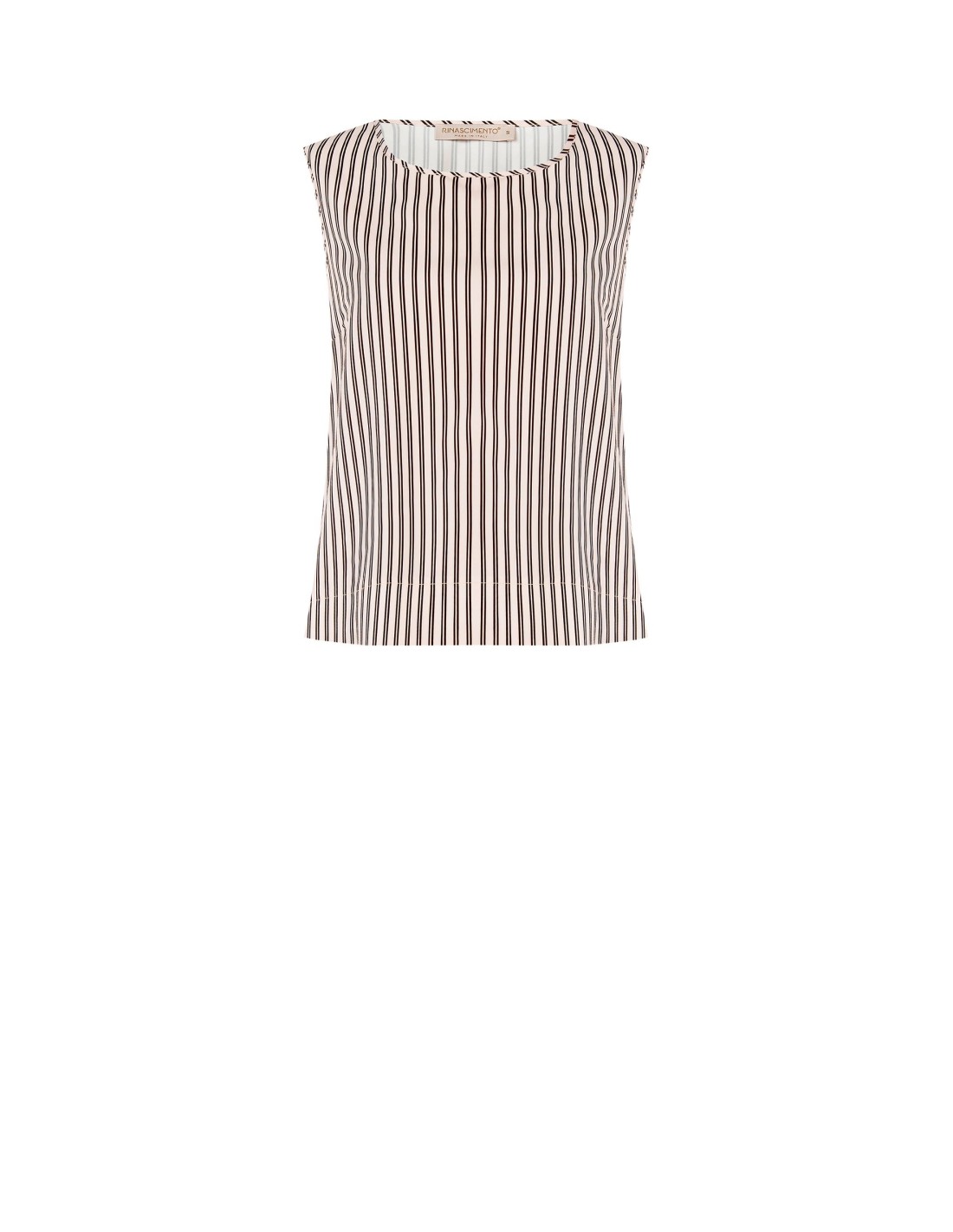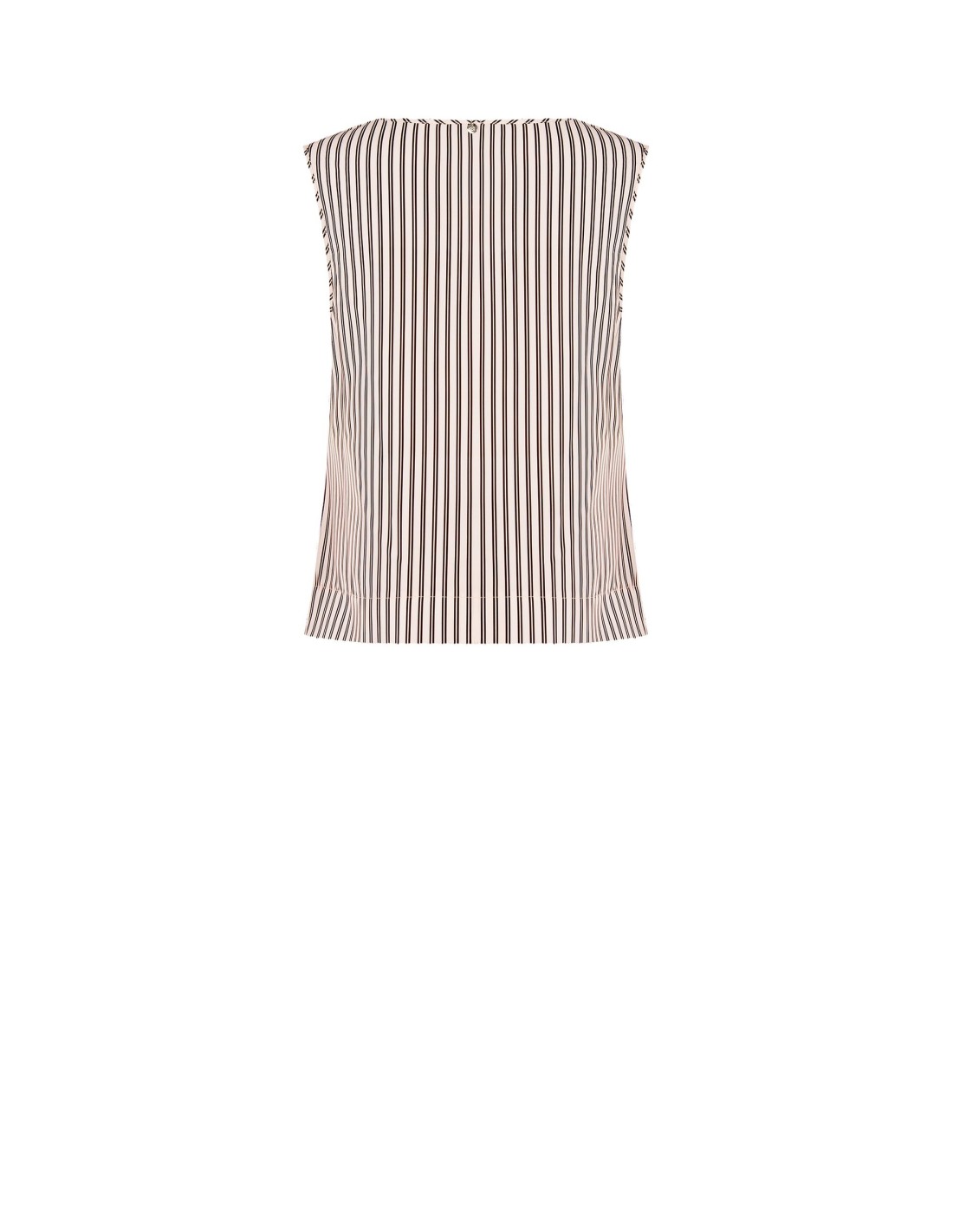 Blusa sem mangas de corte suave, em cetim fluido de textura luminosa que acaricia a silhueta com leveza. O decote redondo e o padrão de riscas verticais alongam a figura, enquanto o fecho na parte de trás completa o design. Perfeita para escritório, aperitivos e elegância do dia a dia.