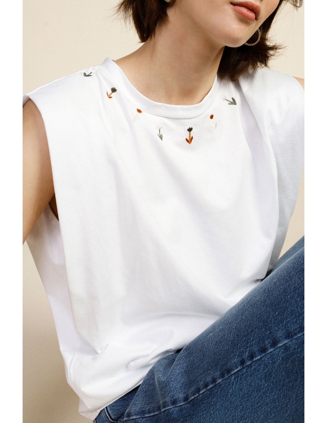 Dá um toque fresco aos teus dias com este top sem mangas, caracterizado por um corte descontraído e delicados bordados florais à volta do decote. Perfeito com jeans ou saias para um look feminino e original, é fácil de usar todos os dias sem abdicar dos pormenores que contam a tua personalidade.