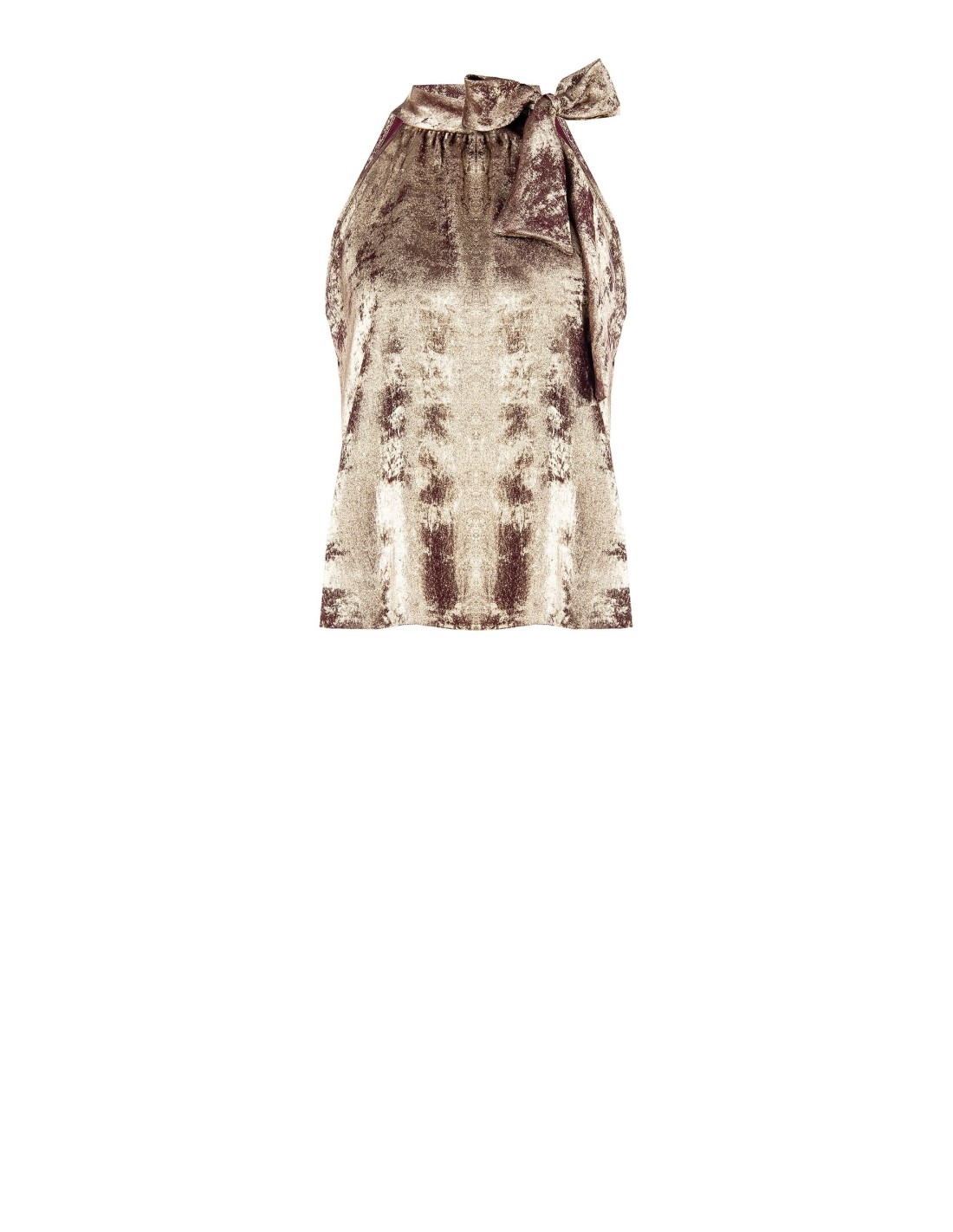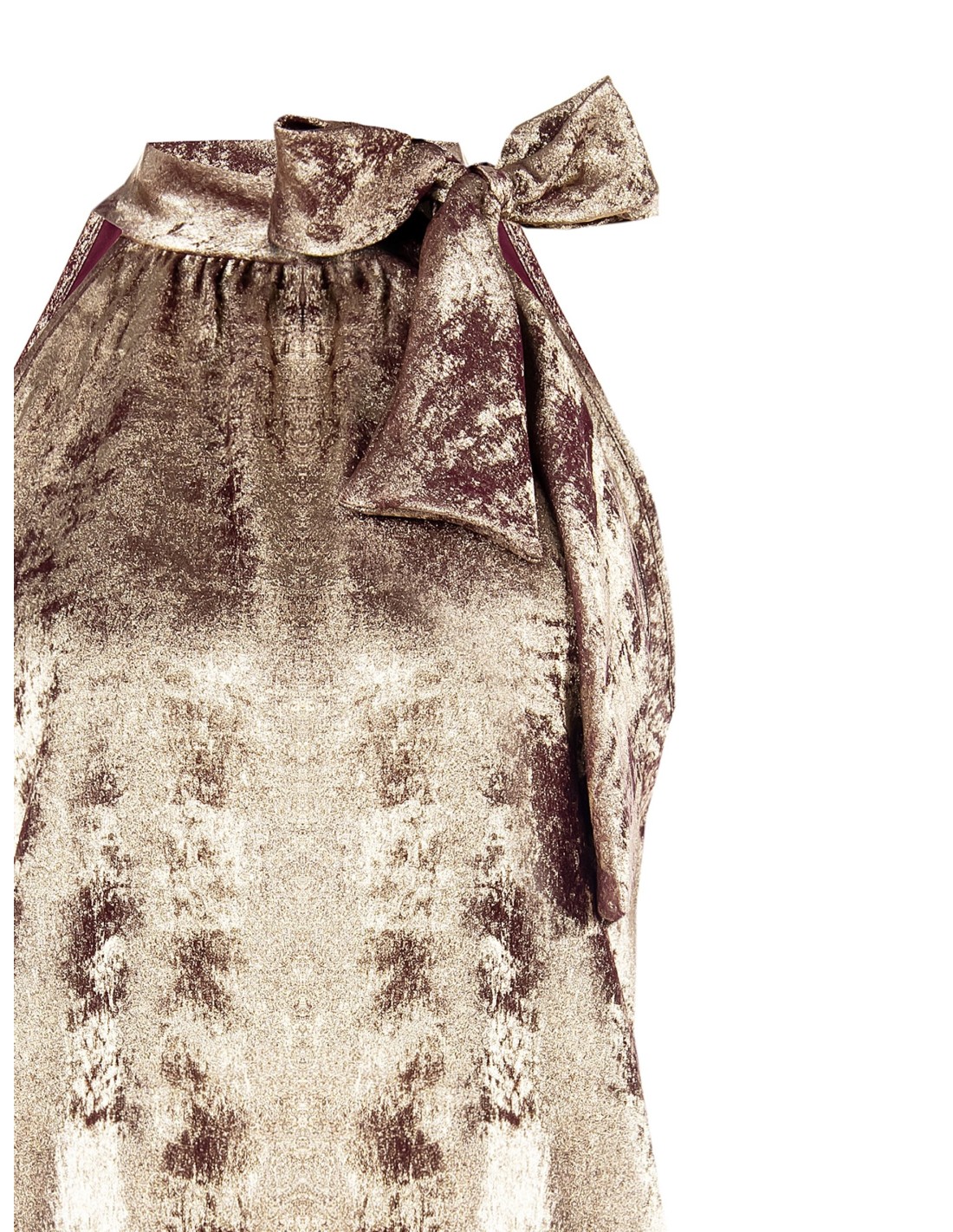 Blusa fluida de corte ligeiramente acinturado que acaricia a silhueta. O tecido laminado, macio e leve, ilumina os movimentos. Gola alta com laço maxi e ombros descobertos para um toque sensual. Perfeita para festas, jantares especiais e aperitivos.