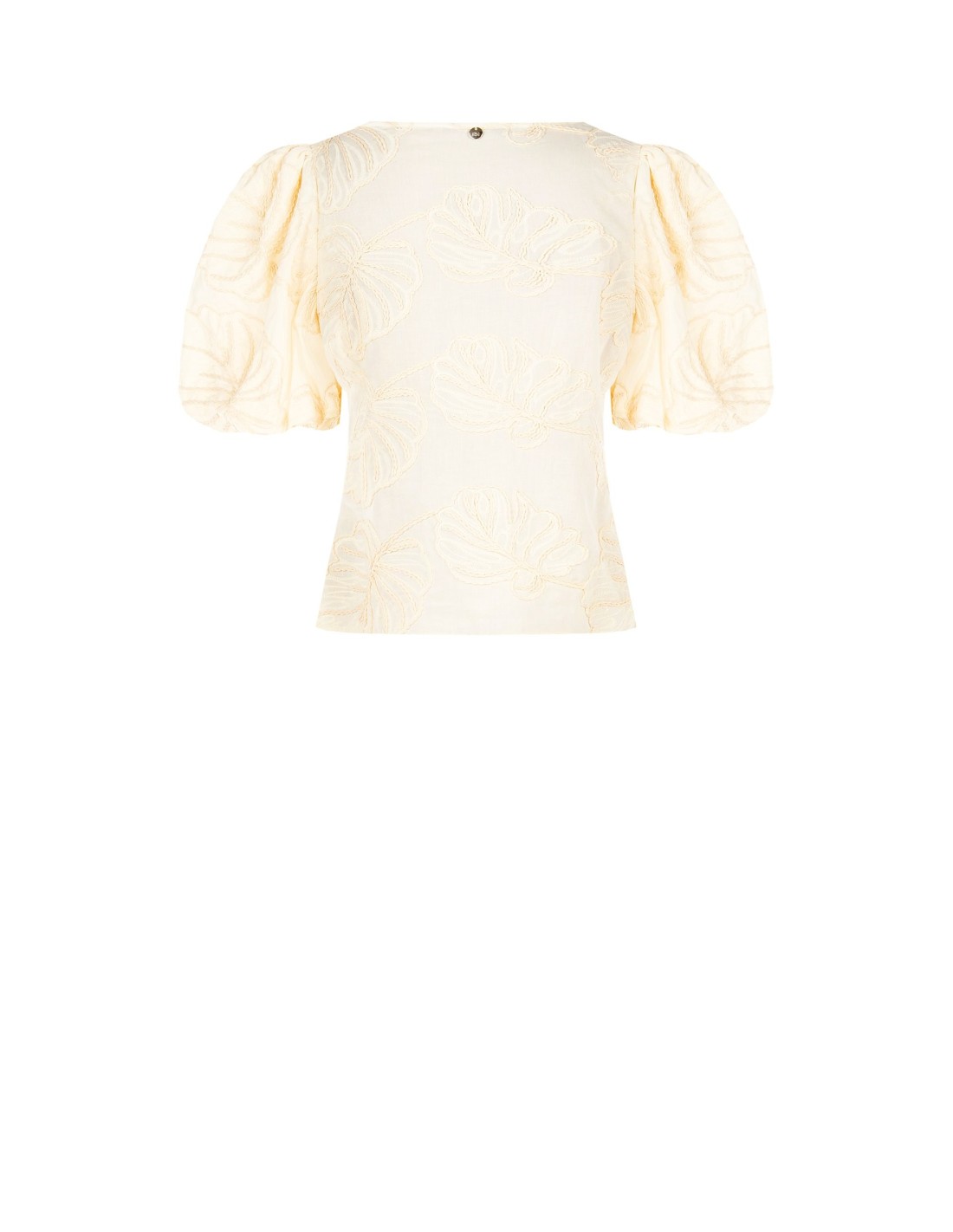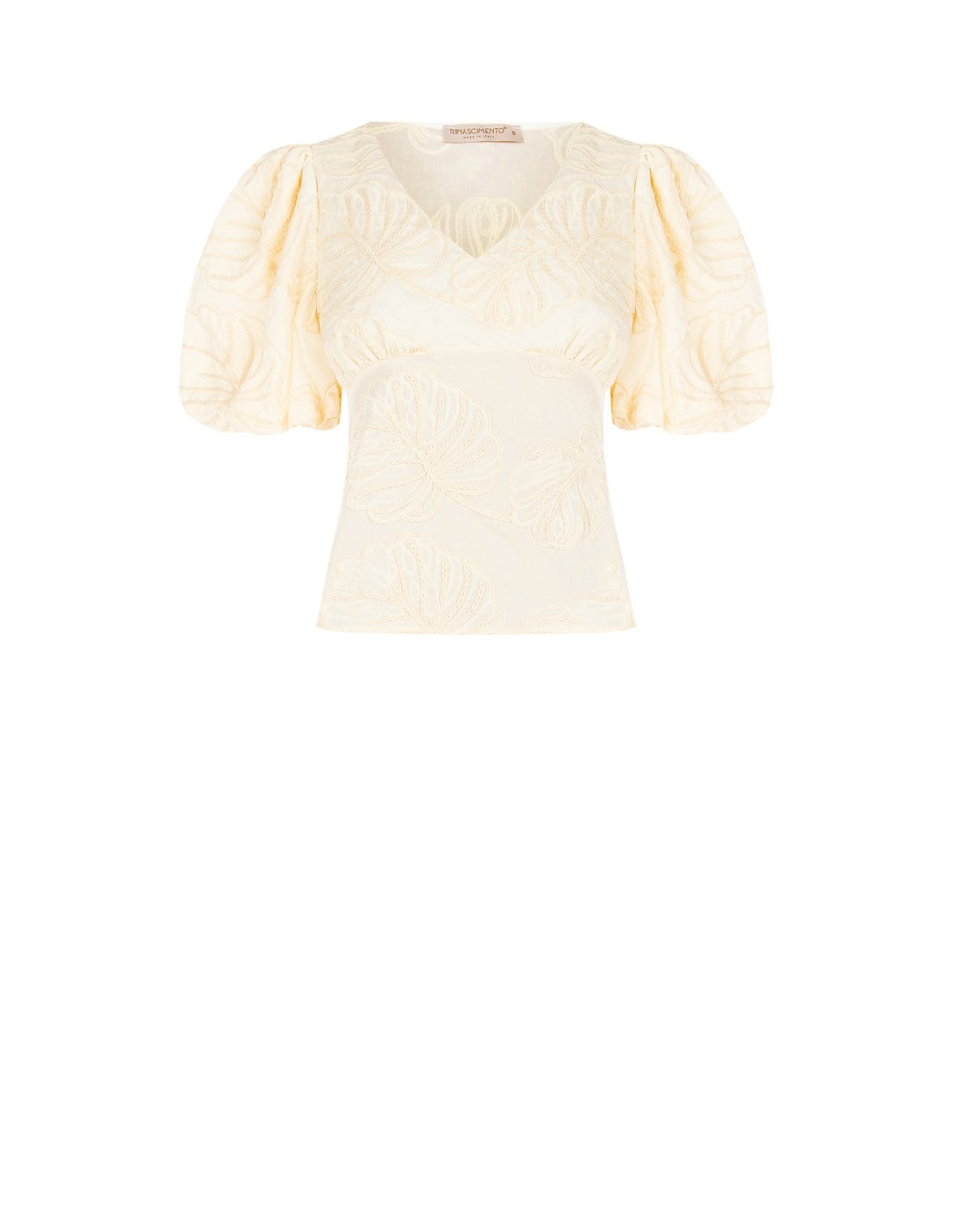 Blusa em algodão de corte justo que acompanha a silhueta com conforto e leveza. A textura bordada com motivo folhagem e o decote em V valorizam o colo, enquanto as mangas bufantes acrescentam carácter. Perfeita do escritório ao aperitivo, com saias ou calças.