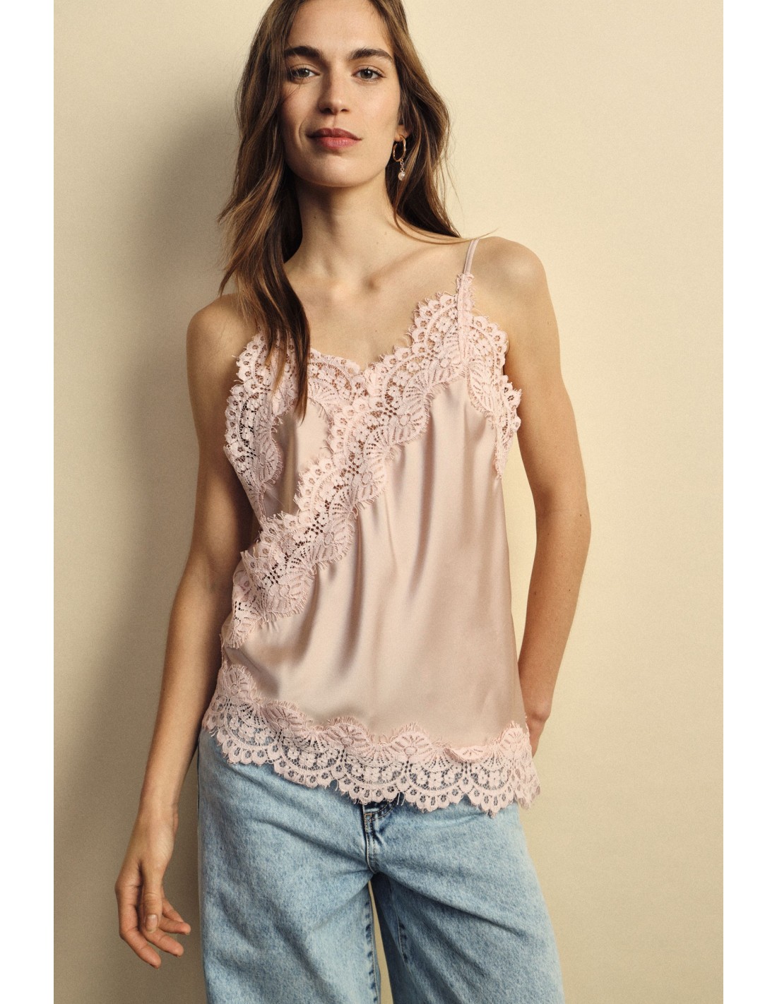 Inspira-te com este top que combina alças finas e uma barra em renda assimétrica para um efeito delicado e original. Perfeito para usar tanto com jeans como por baixo de um blazer, valoriza o teu estilo com pormenores femininos e um ajuste leve. Ideal para te sentires confortável e refinada todos os dias.