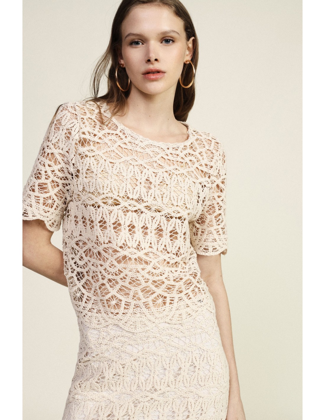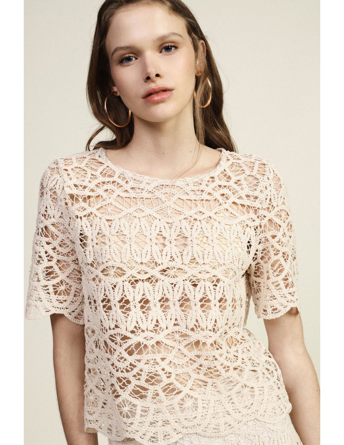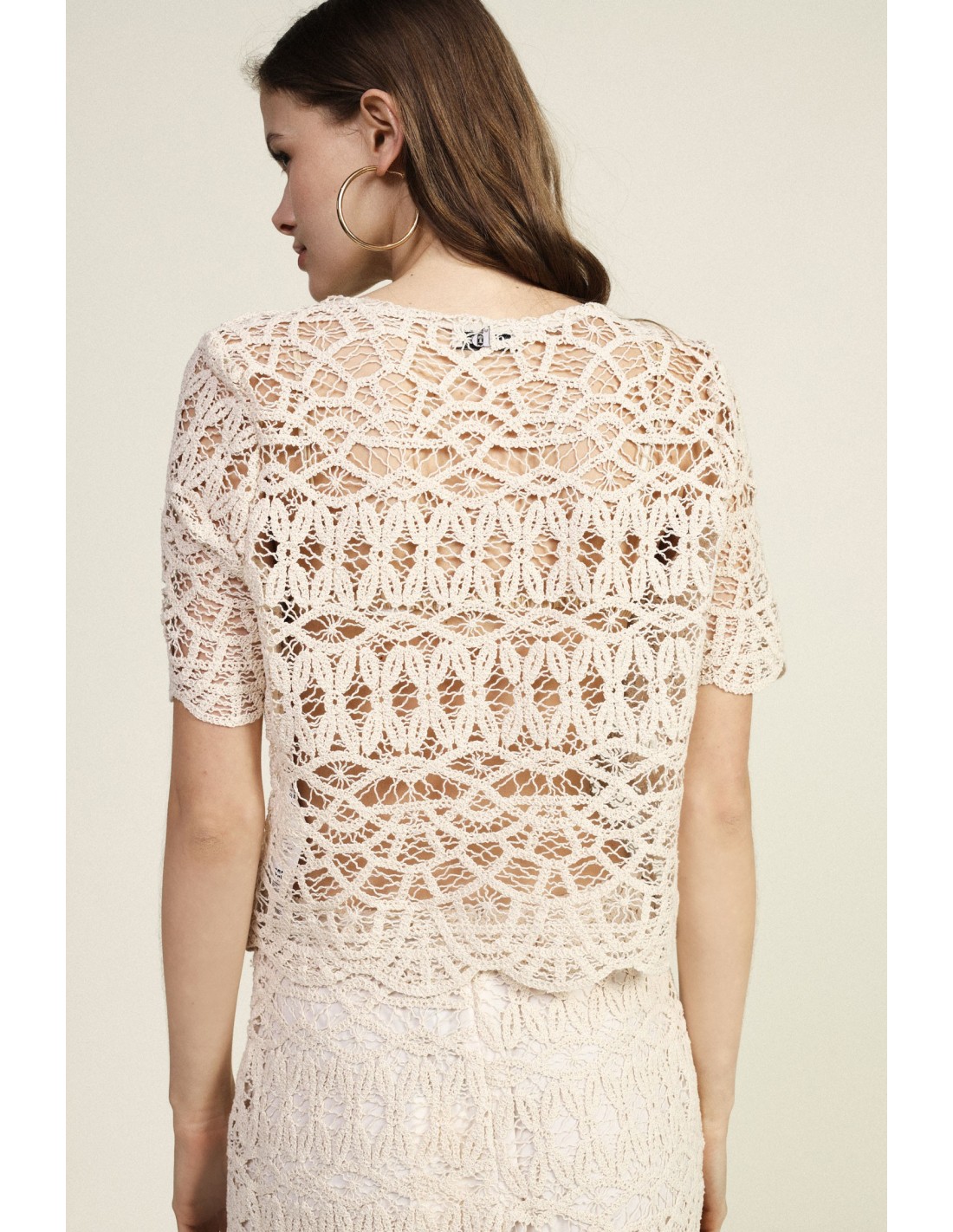 Um top rendado curto que transmite leveza e personalidade graças ao padrão requintado e à borda festonada. As mangas curtas e o corte reto tornam-no ideal para dar um toque distintivo aos looks do dia a dia. Perfeito para usar com jeans ou saias para um estilo feminino que não passa despercebido.