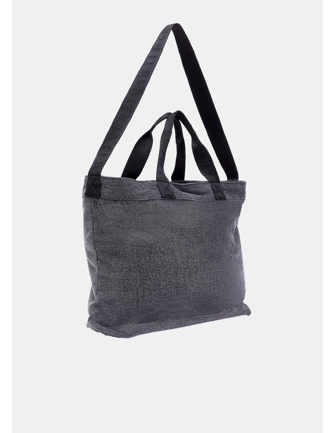 Saco tote em denim, maxi logo com tachas, forro interior com logo estampado, alça em grosgrain.
