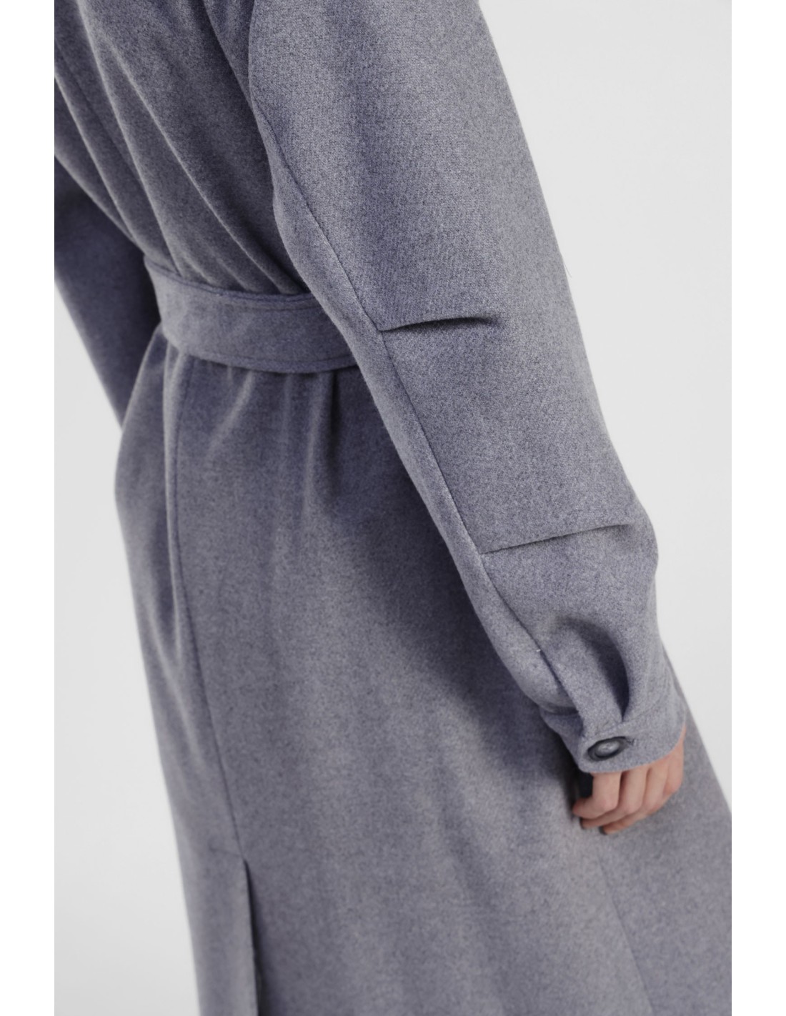 Um trench-coat longo de corte marcante, com amplas lapelas e fecho de abotoamento duplo. O cinto na cintura permite realçar a silhueta e ajustar o caimento, enquanto os bolsos laterais acrescentam praticidade no dia a dia. Ideal para te acompanhar em cada deslocação com um pormenor requintado.