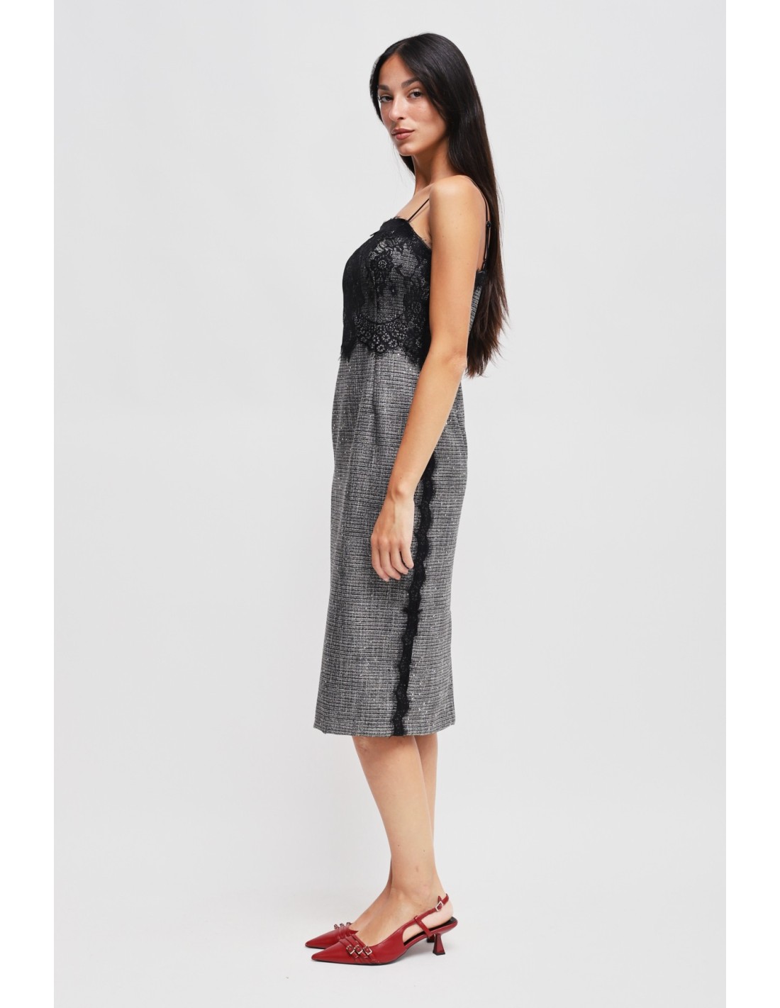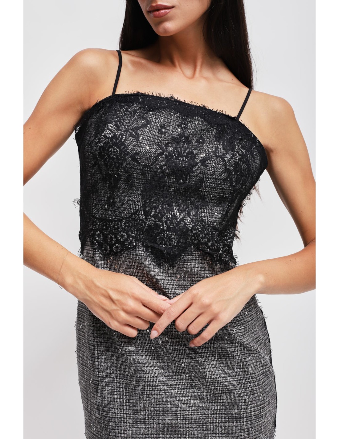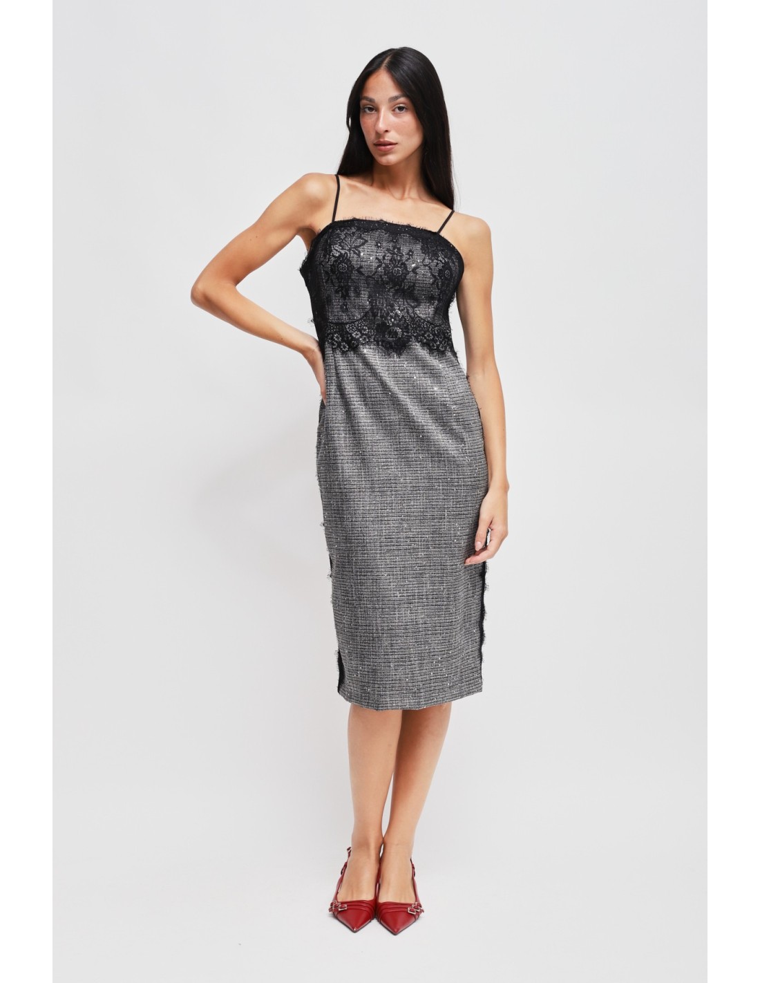Vestido tubinho enriquecido com um corpete em renda em contraste; o corte moderno e as micro-lantejoulas tornam esta peça perfeita para qualquer ocasião. Combina com a jaqueta coordenada para um look completo e sofisticado.