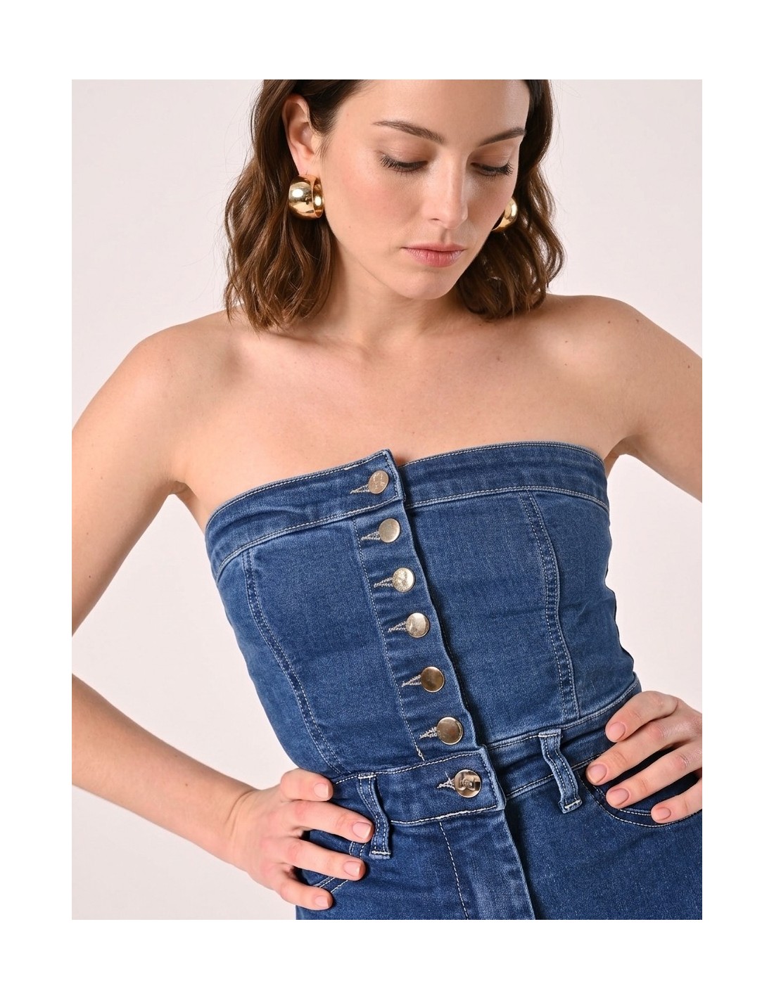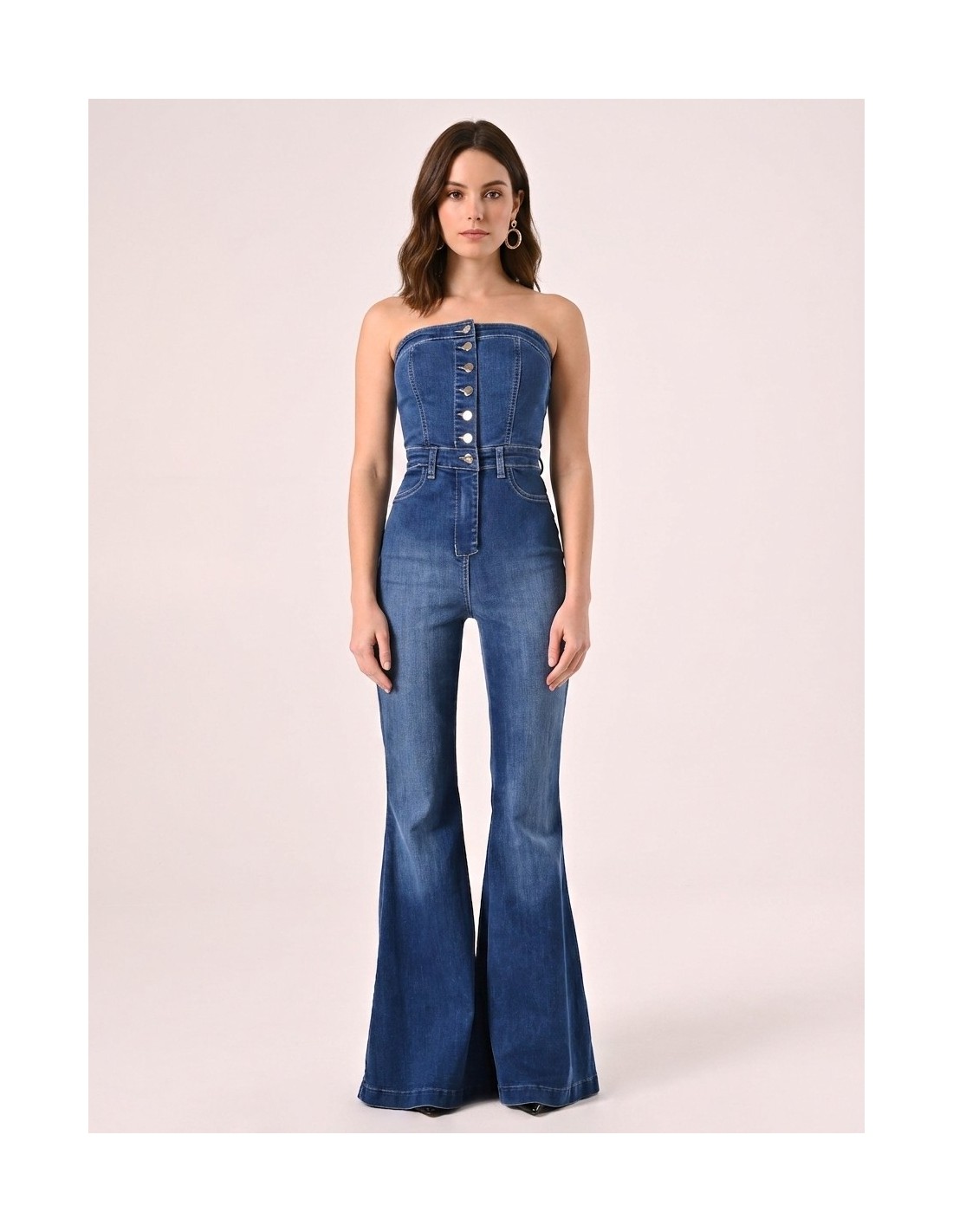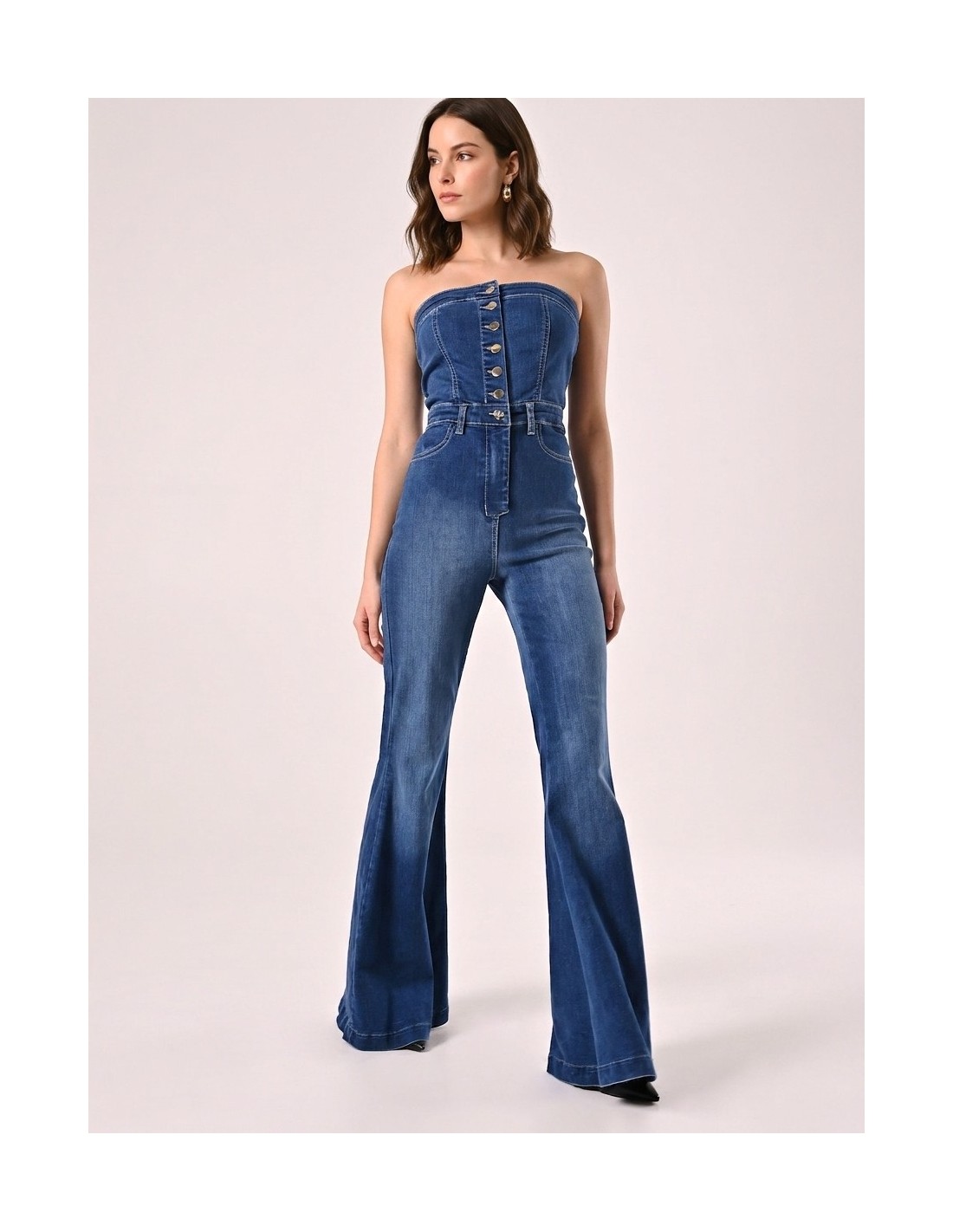 Macacão inteiro em ganga macia de corte justo que realça a cintura e alonga a silhueta com perna evasada. O decote reto sem alças e os botões frontais acrescentam carácter. Perfeito do aperitivo à festa, com conforto e estilo da manhã à noite.