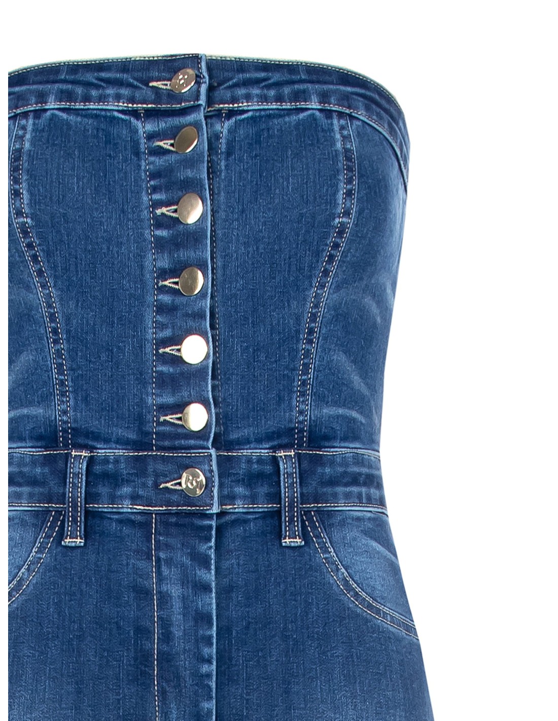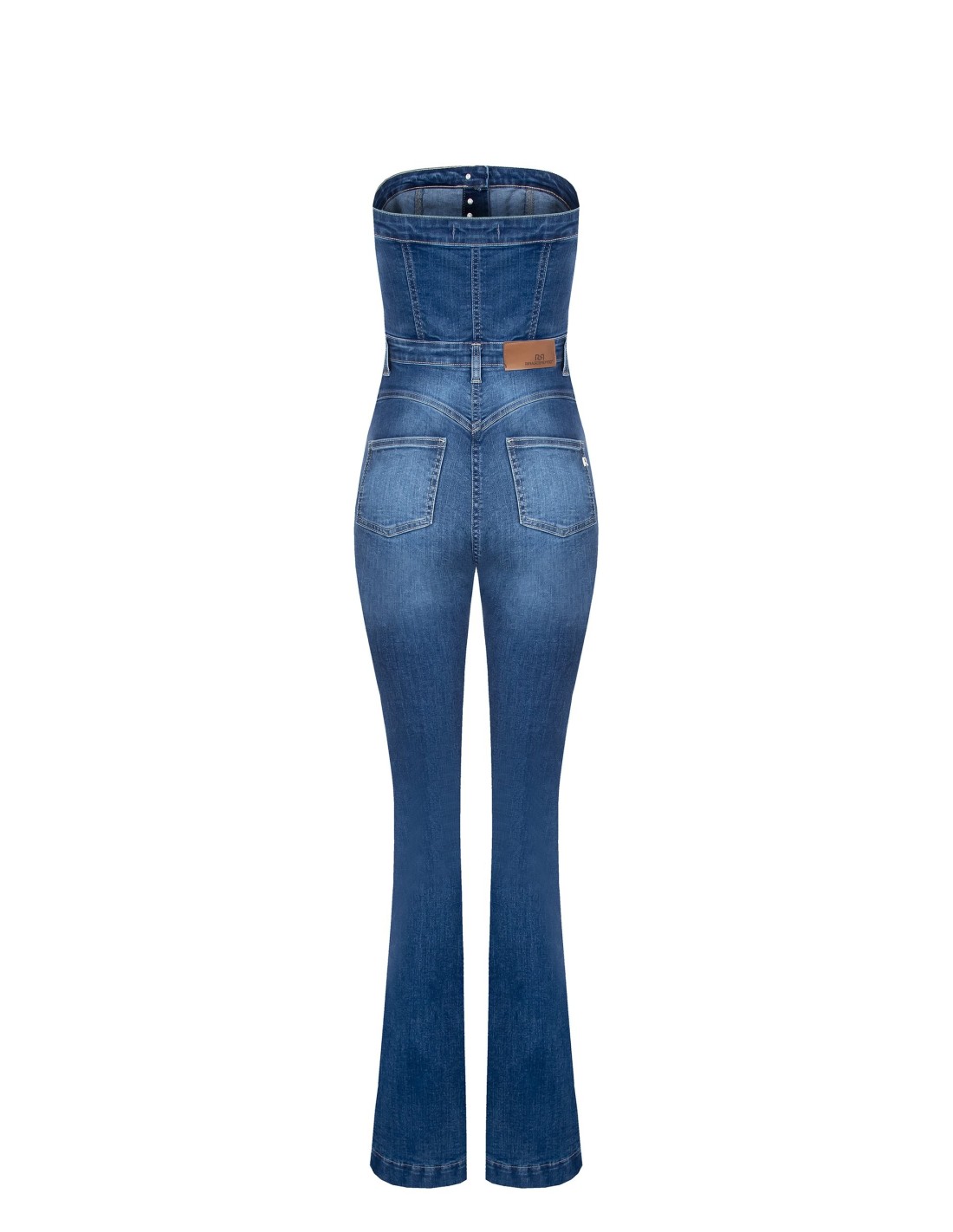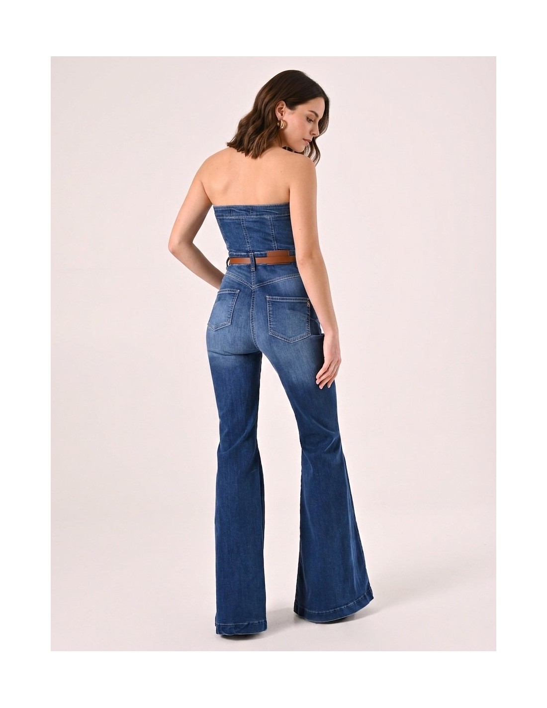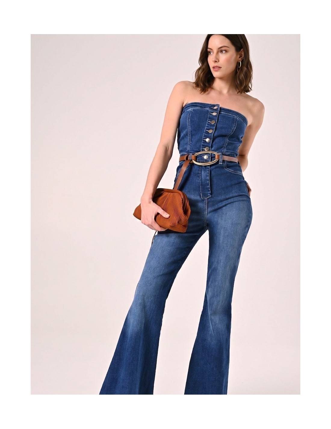 Macacão inteiro em ganga macia de corte justo que realça a cintura e alonga a silhueta com perna evasada. O decote reto sem alças e os botões frontais acrescentam carácter. Perfeito do aperitivo à festa, com conforto e estilo da manhã à noite.