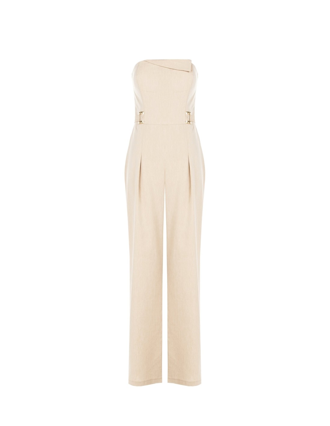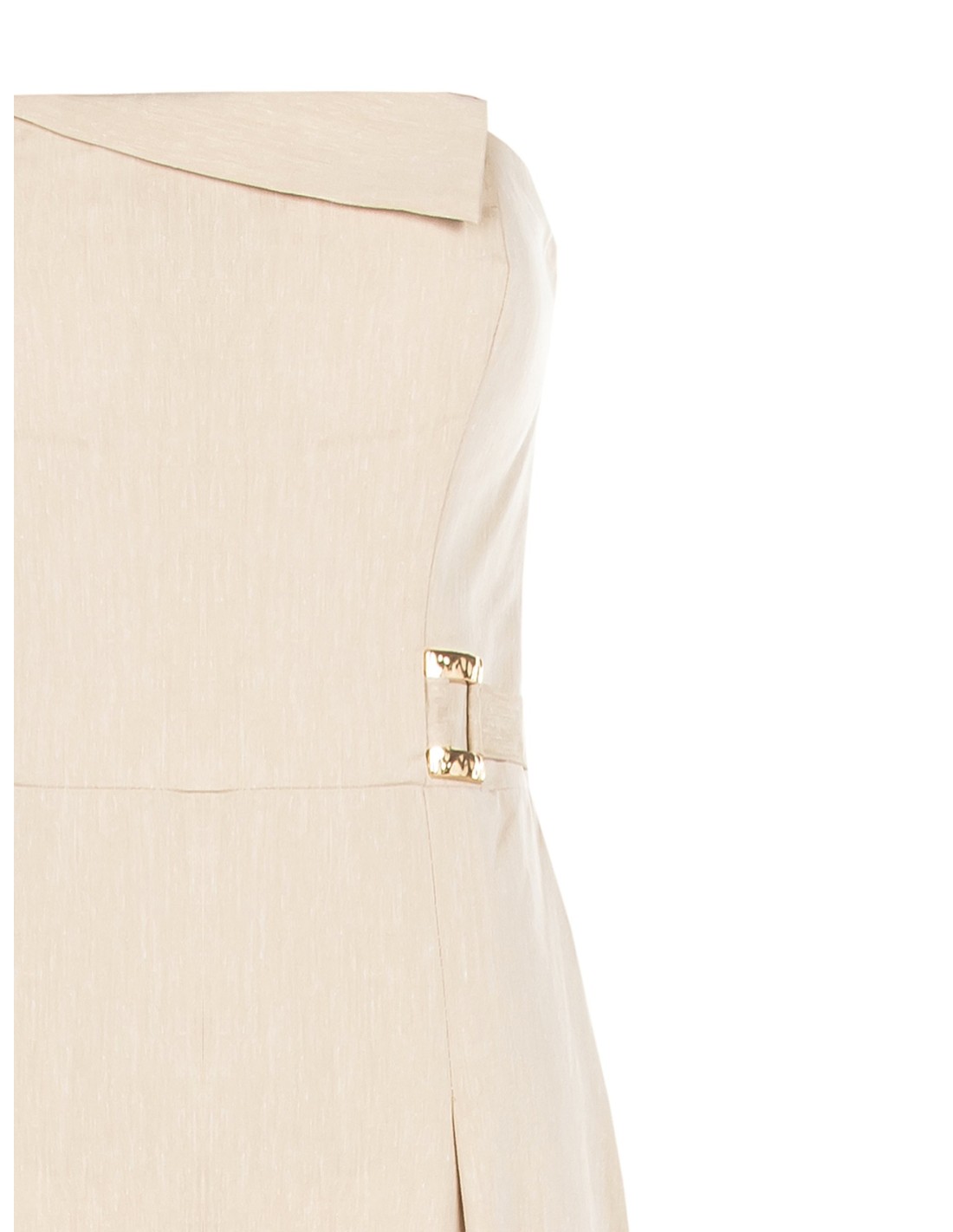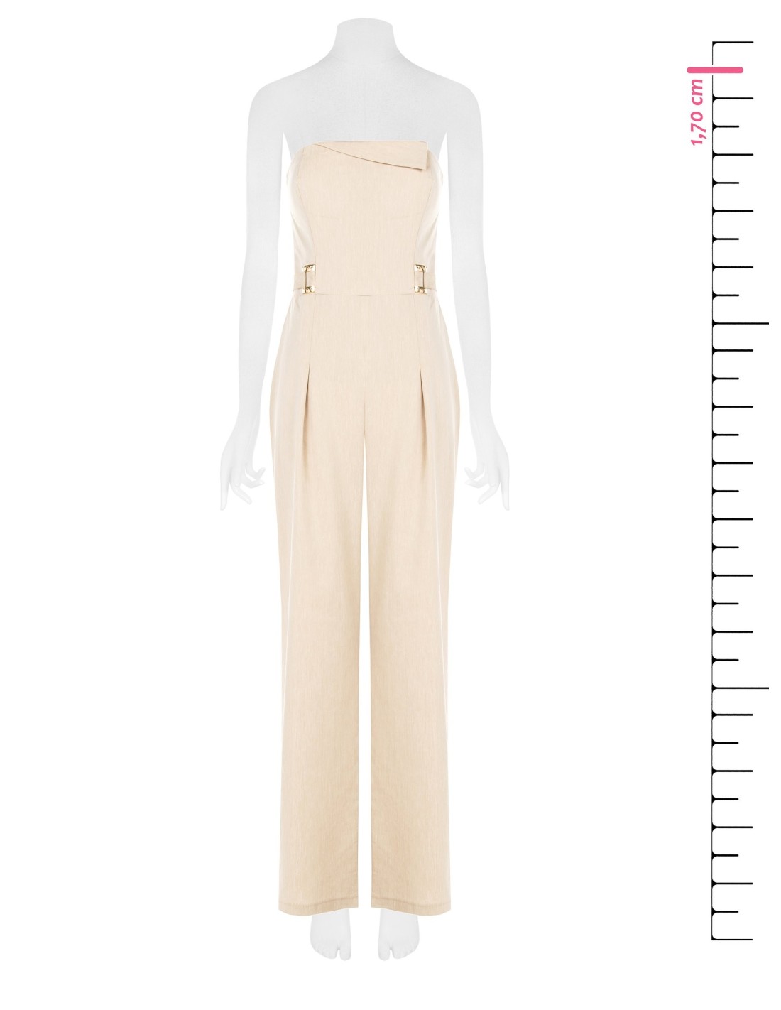 Peça inteira com corte recto e fluido, em mistura de lyocell e linho com textura fresca e leve. O decote em faixa com detalhe assimétrico e os detalhes tipo joia na cintura valorizam a silhueta com conforto. Perfeito para eventos, aperitivos elegantes ou dias na cidade.