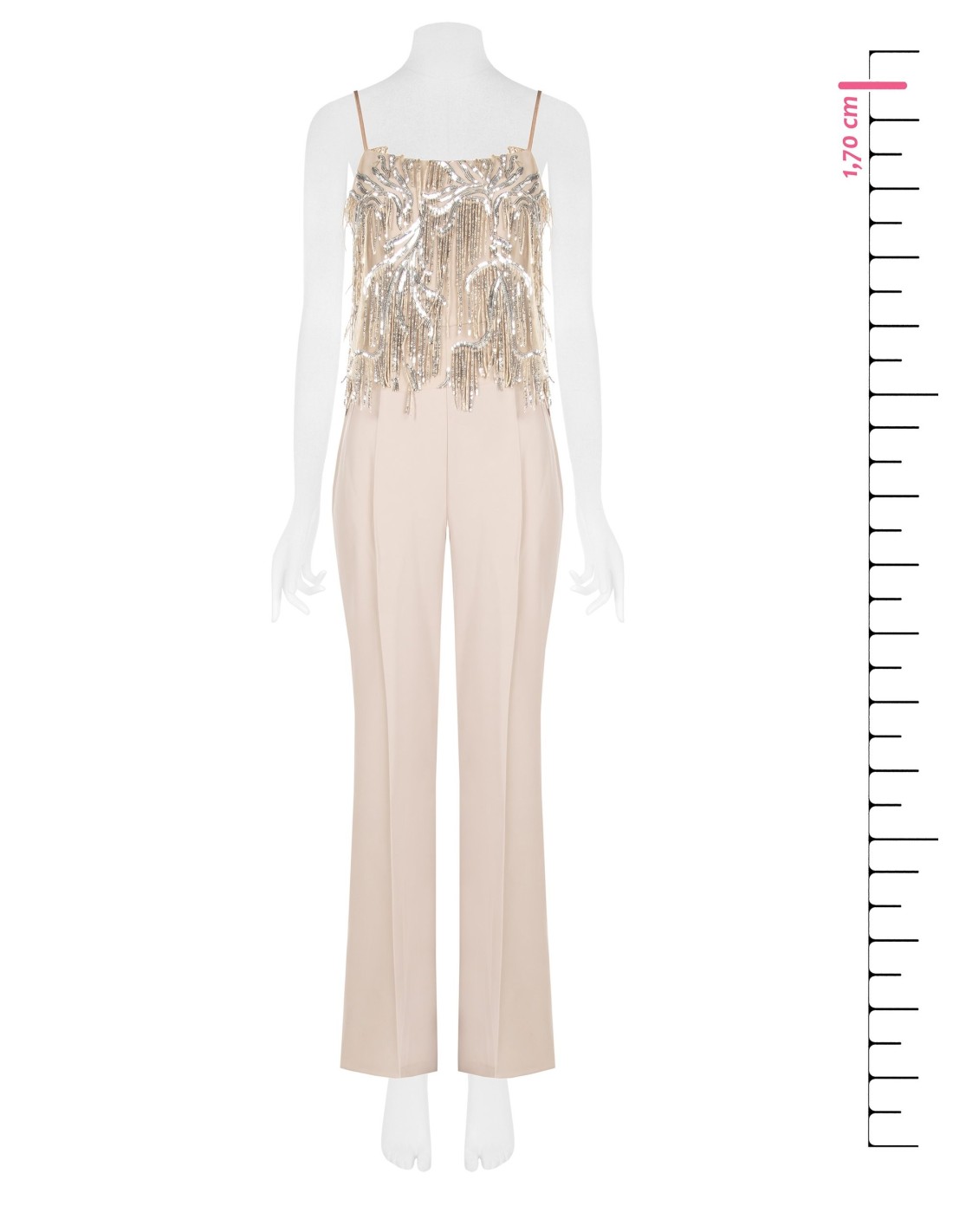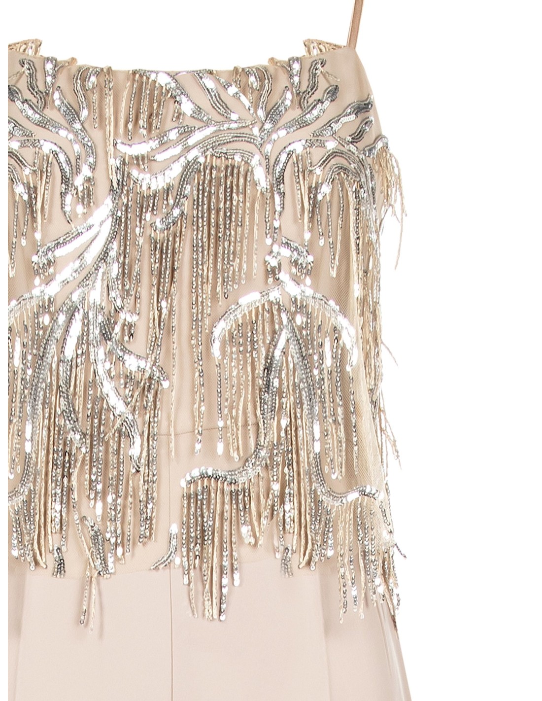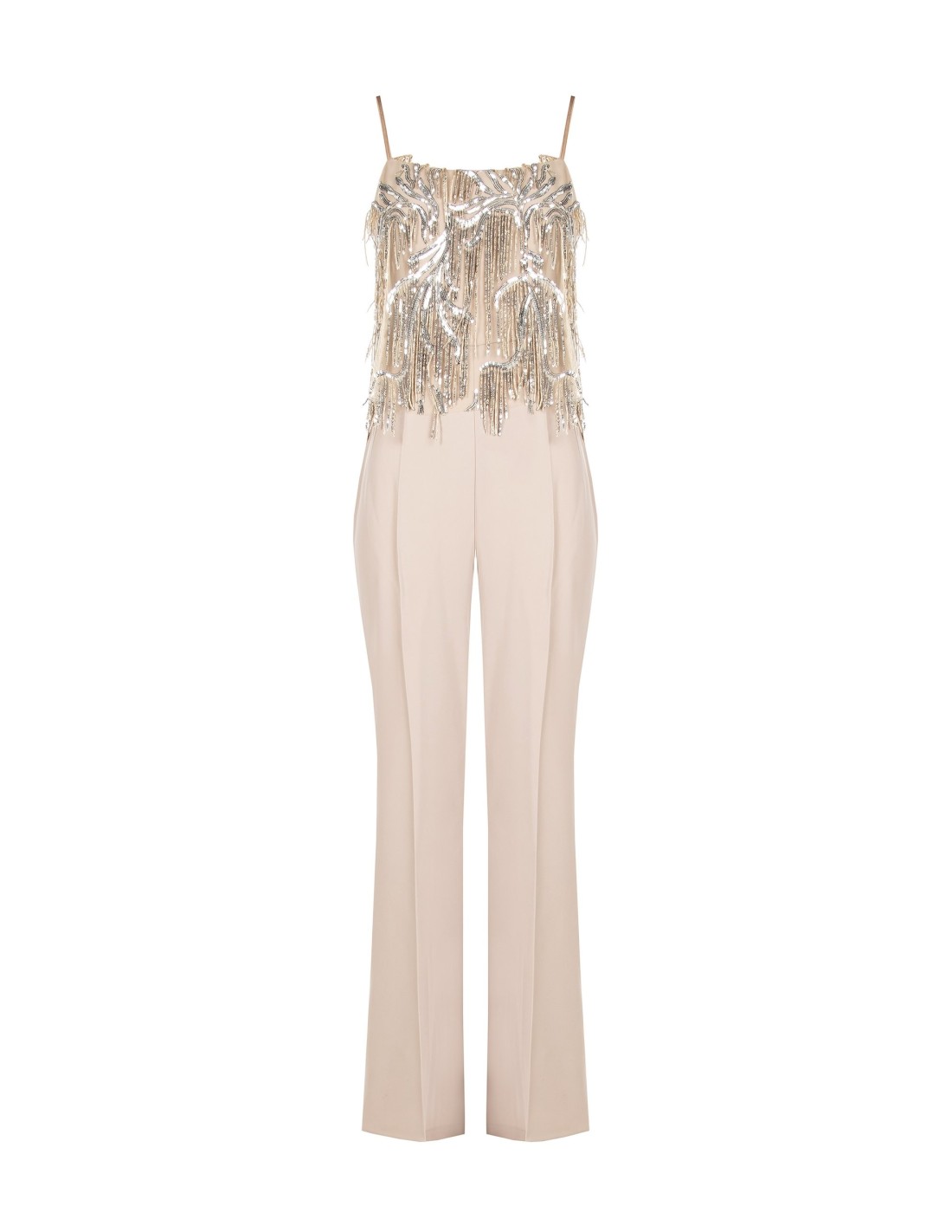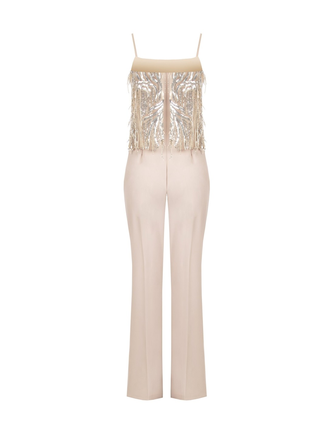 Macacão de corte fluido e alongado, em tecido leve que acompanha os movimentos com conforto. O corpete com decote reto e alças finas é iluminado por bordados com lantejoulas e franjas, para uma silhueta elegante e versátil, perfeita para festas, cerimónias e eventos noturnos.