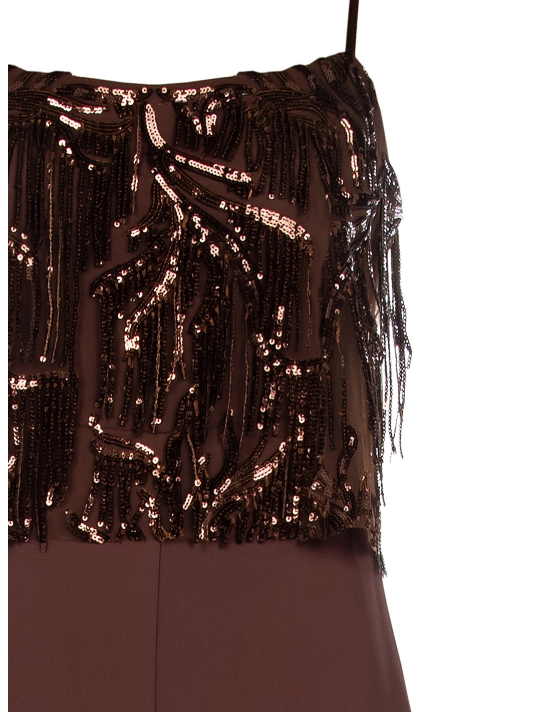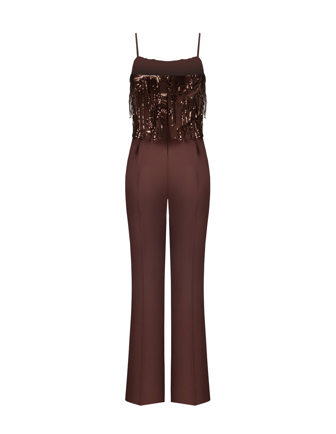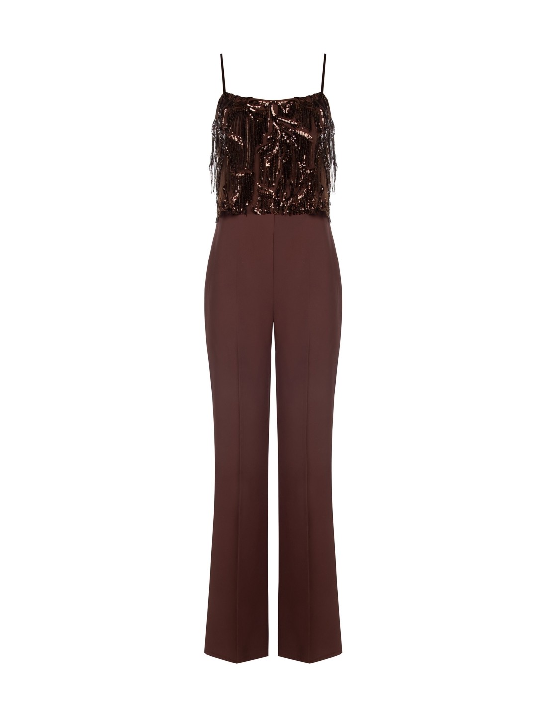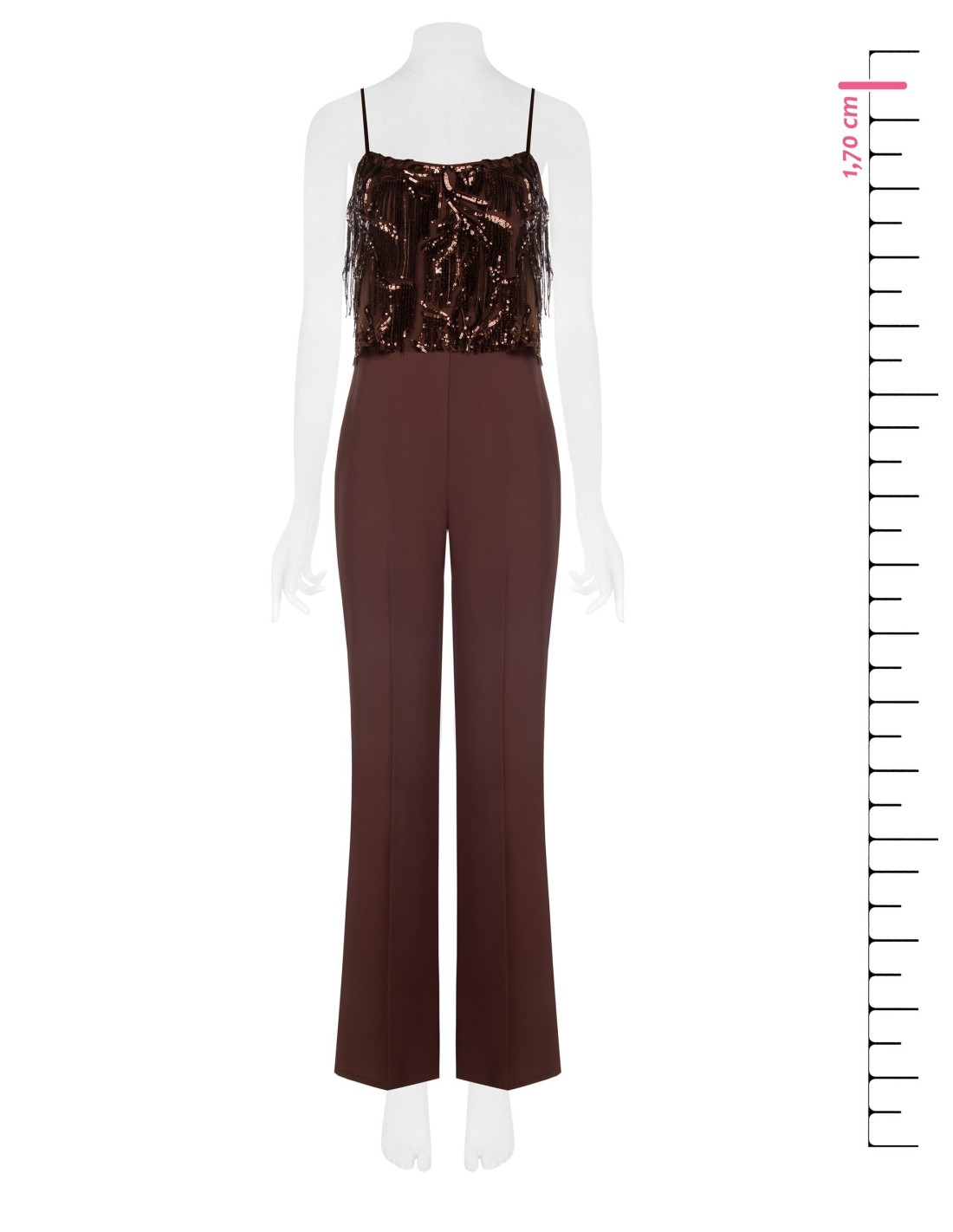Macacão de corte fluido e alongado, em tecido leve que acompanha os movimentos com conforto. O corpete com decote reto e alças finas é iluminado por bordados com lantejoulas e franjas, para uma silhueta elegante e versátil, perfeita para festas, cerimónias e eventos noturnos.