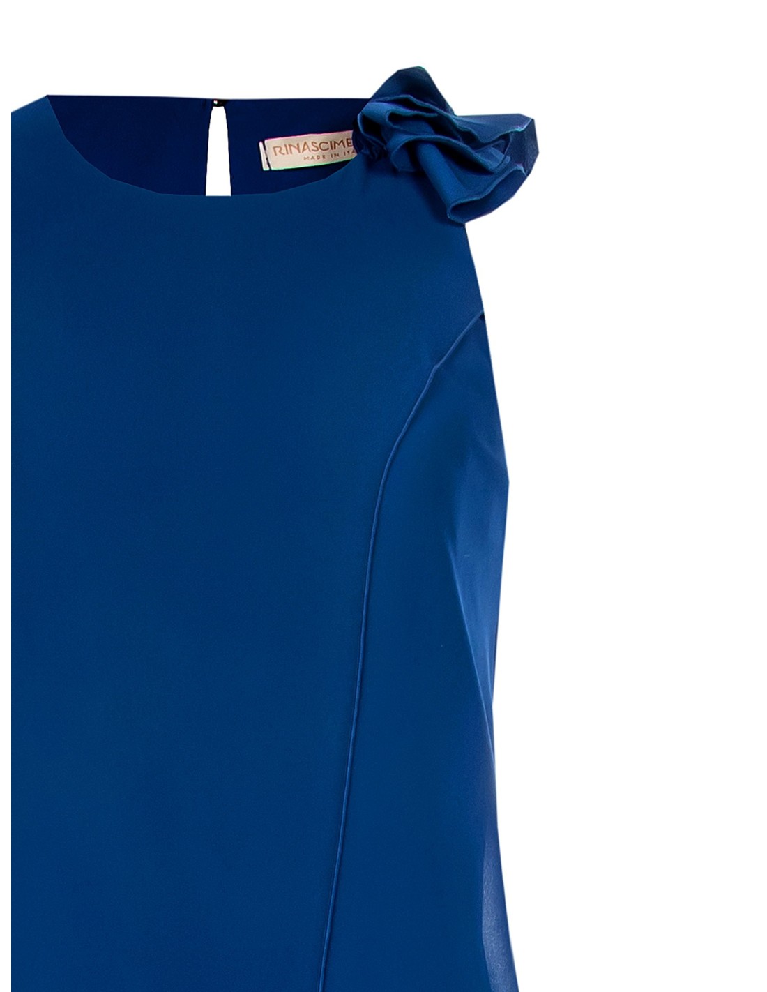 Linha suave e perna ampla em tecido fluido com efeito crepe que alonga a silhueta e acompanha os movimentos. O painel frontal sobreposto cria uma abertura elegante, valorizada pela aplicação de flor no ombro. Perfeita para cerimónias, cocktails e festas noturnas.