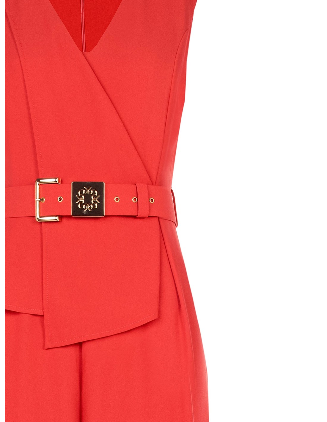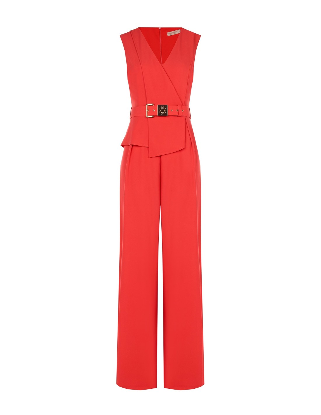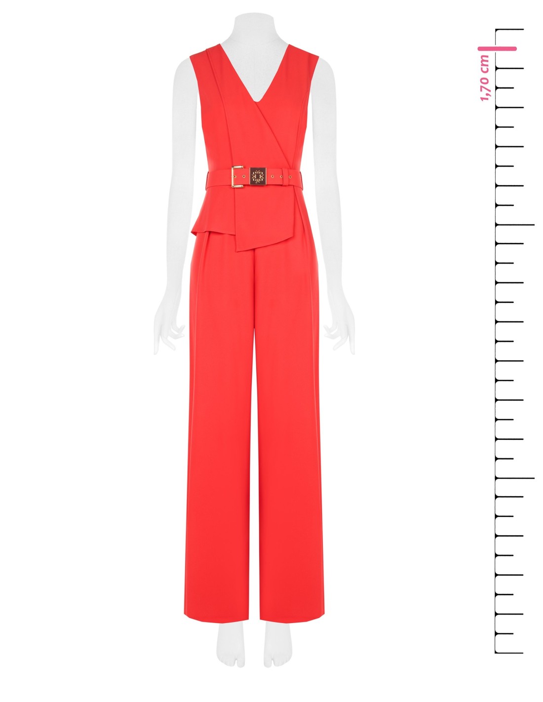 Peça inteira em tecido macio e fluido, com corte fluido e perna ampla que alonga a silhueta. Decote em V cruzado e drapeado na cintura, definido por cinto com fivela joia. Perfeito para cerimónias, ocasiões especiais e looks de noite que exigem elegância sem esforço.