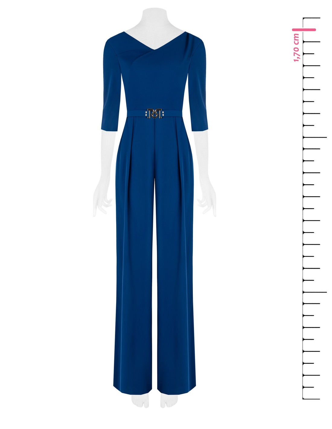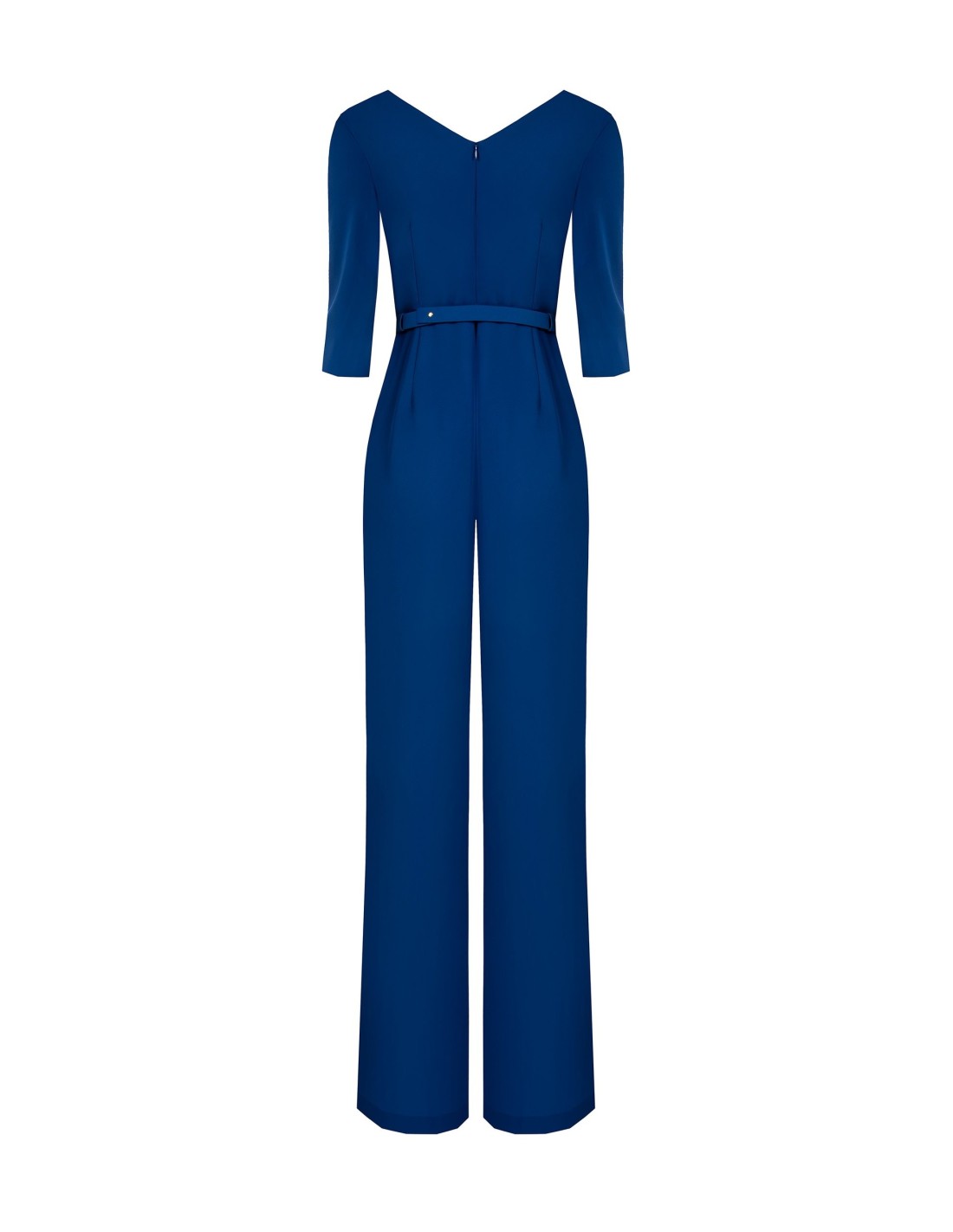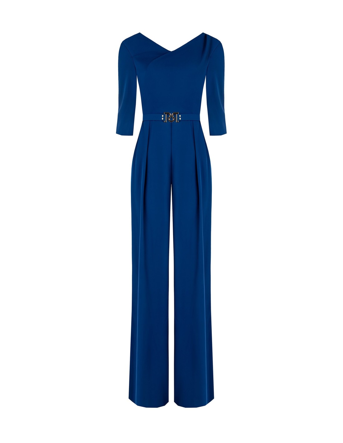 Macacão em tecido fluido stretch, silhueta ajustada na parte superior e calça ampla que alonga a figura. Decote em V cruzado e cinto com fivela com logo metálico definem a cintura. Perfeito do escritório ao aperitivo noturno.