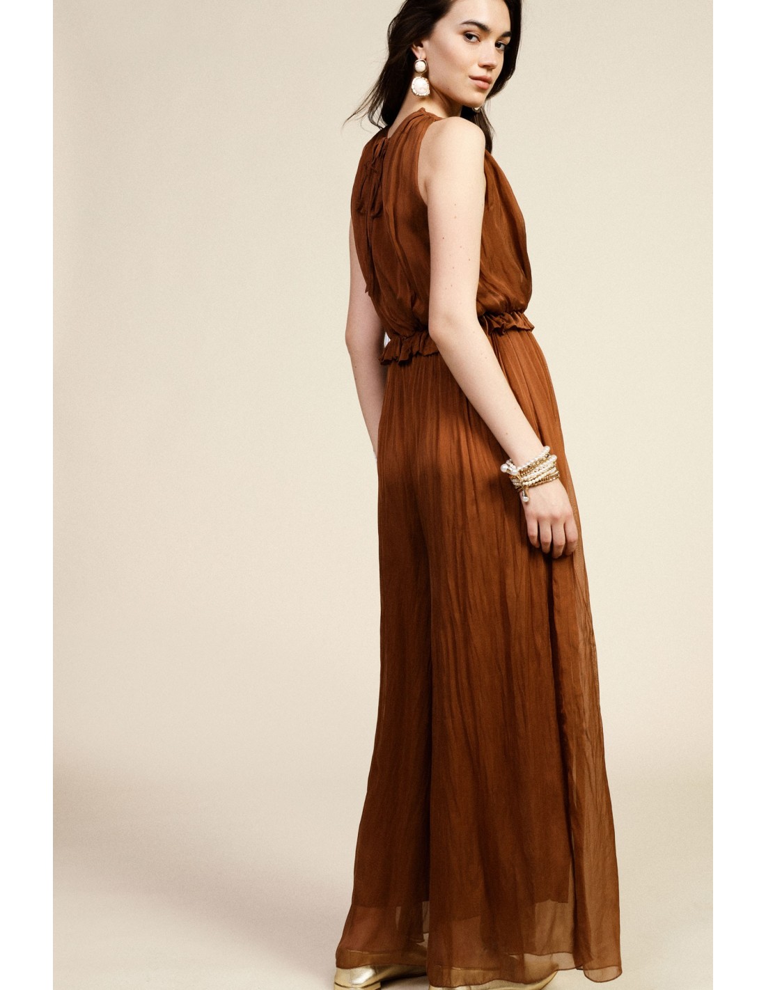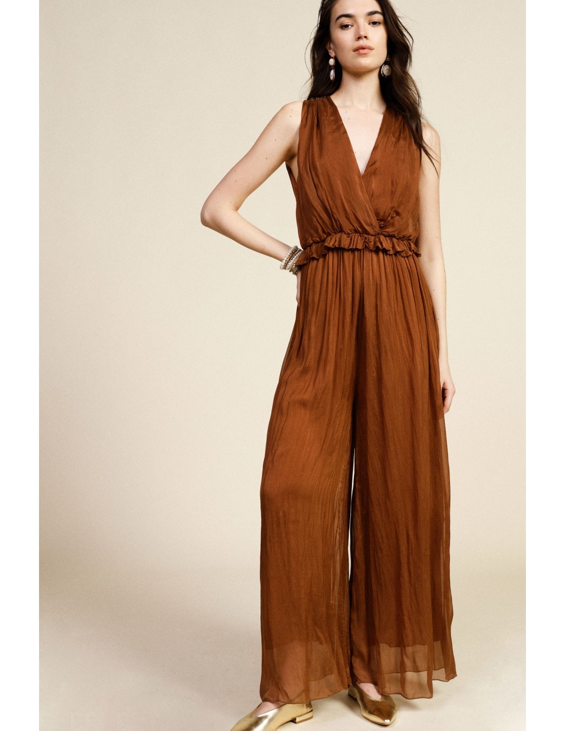 Este macacão sem mangas conquista pela sua linha fluida e leve, perfeito para sentir-se confortável ao longo de todo o dia. O decote em V valoriza o decote enquanto a cintura franzida confere movimento e praticidade. Ideal para looks femininos e originais, usa-se facilmente tanto para saídas informais como para ocasiões especiais.