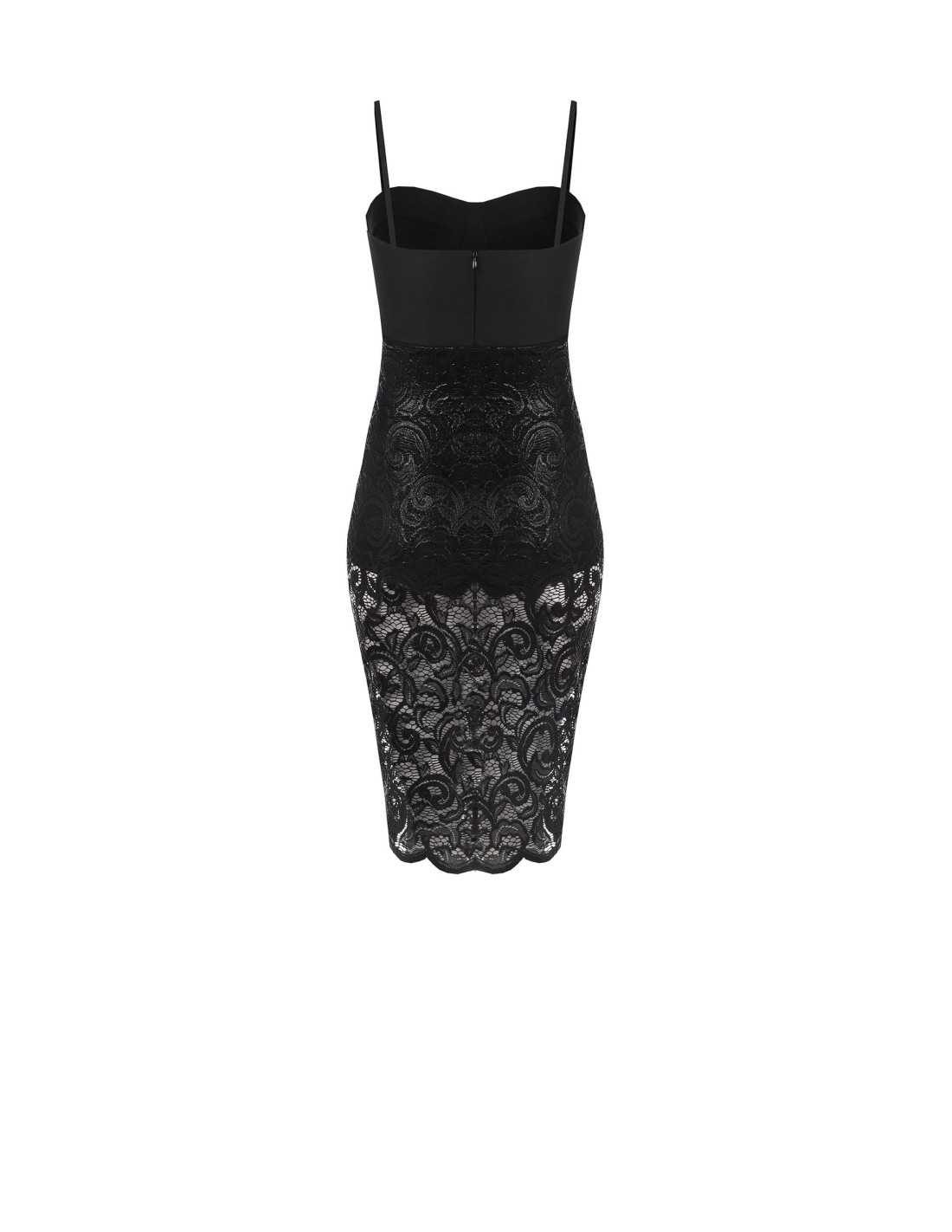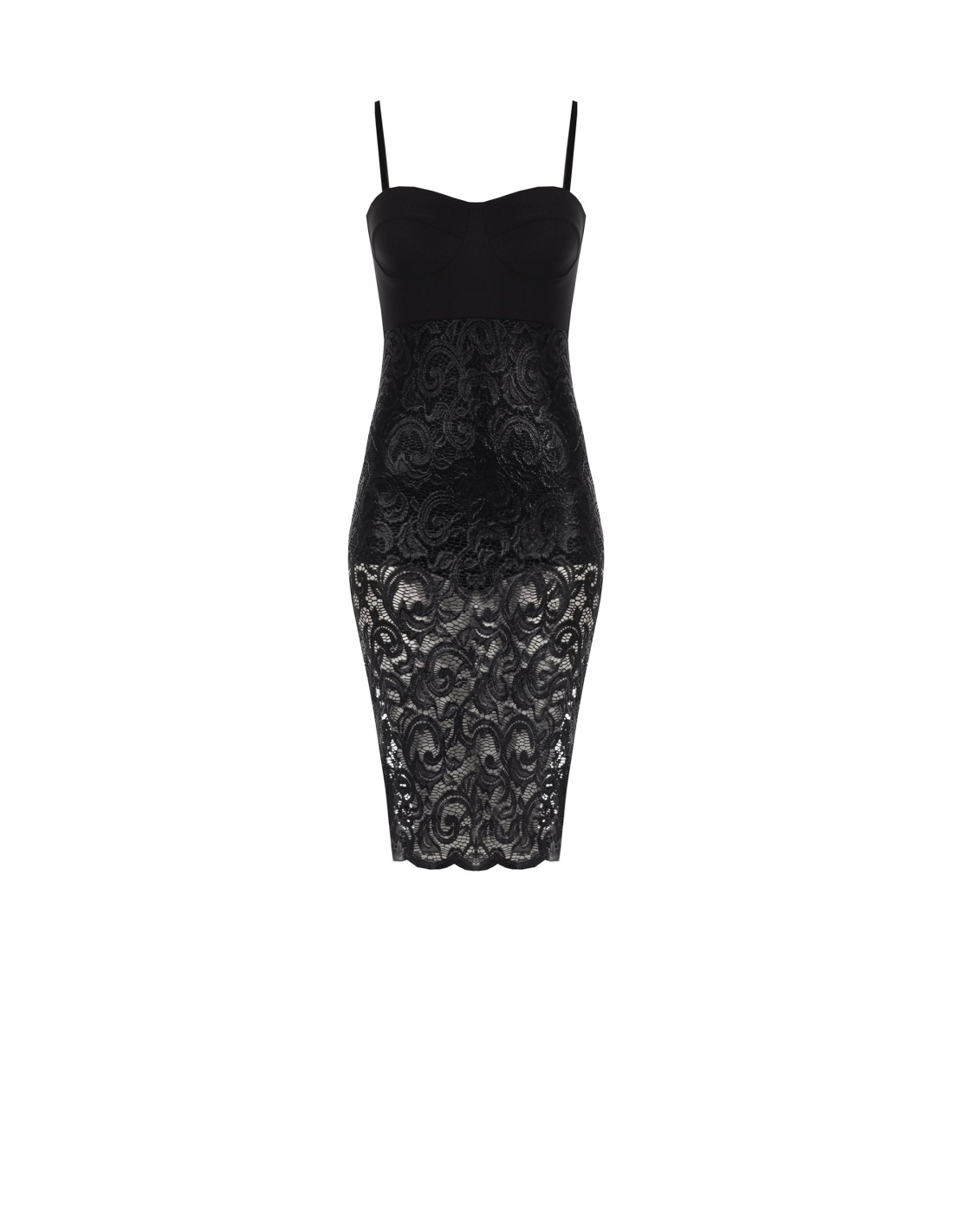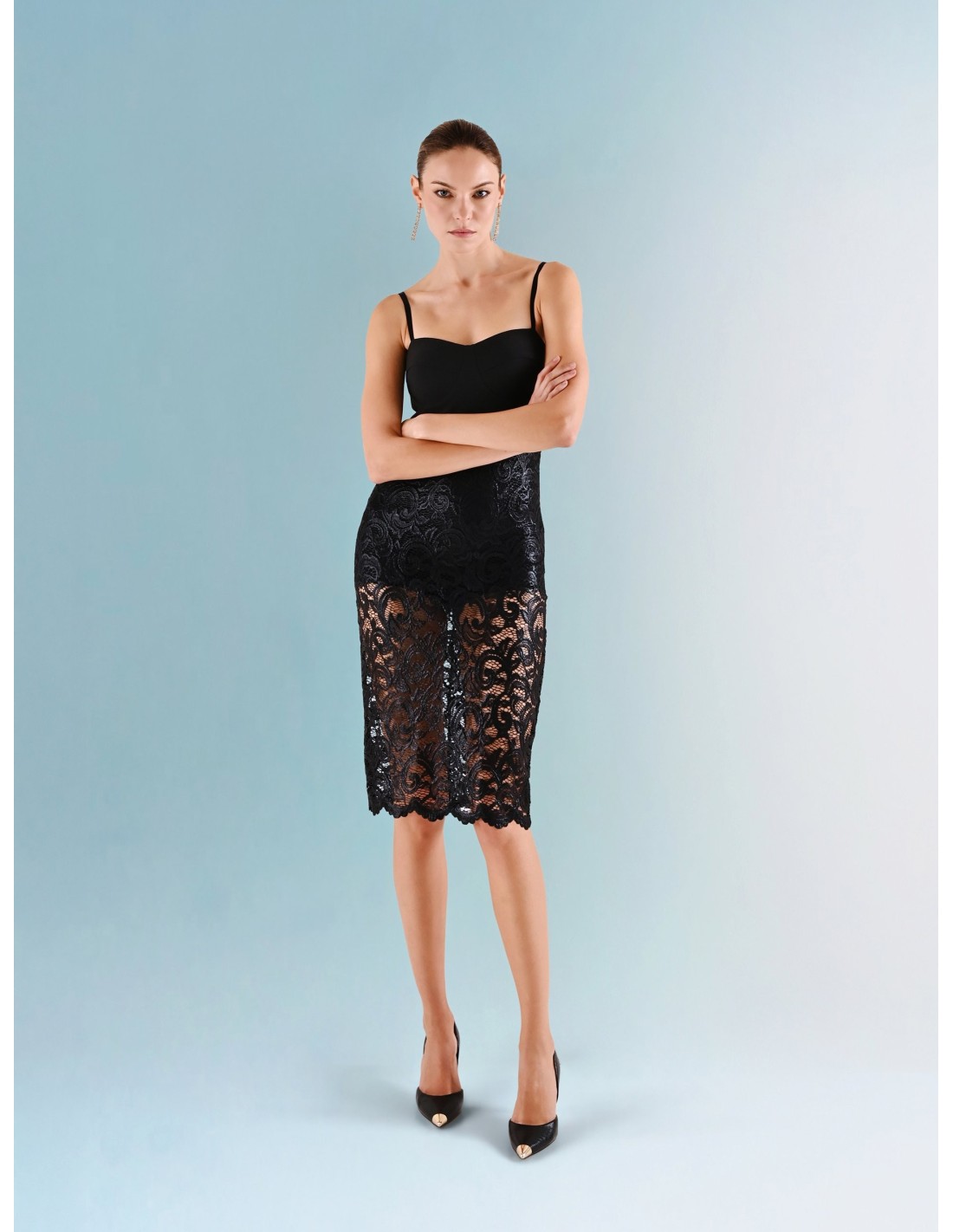 Rinascimento assina um tubinho justo com corte esculpido e confortável. Corpete com copas modeladoras e alças finas, saia em renda revestida semi-transparente com bainha festoneada; calções interiores para liberdade de movimento. Perfeito para festas e noites especiais, realça a silhueta com elegância descontraída.