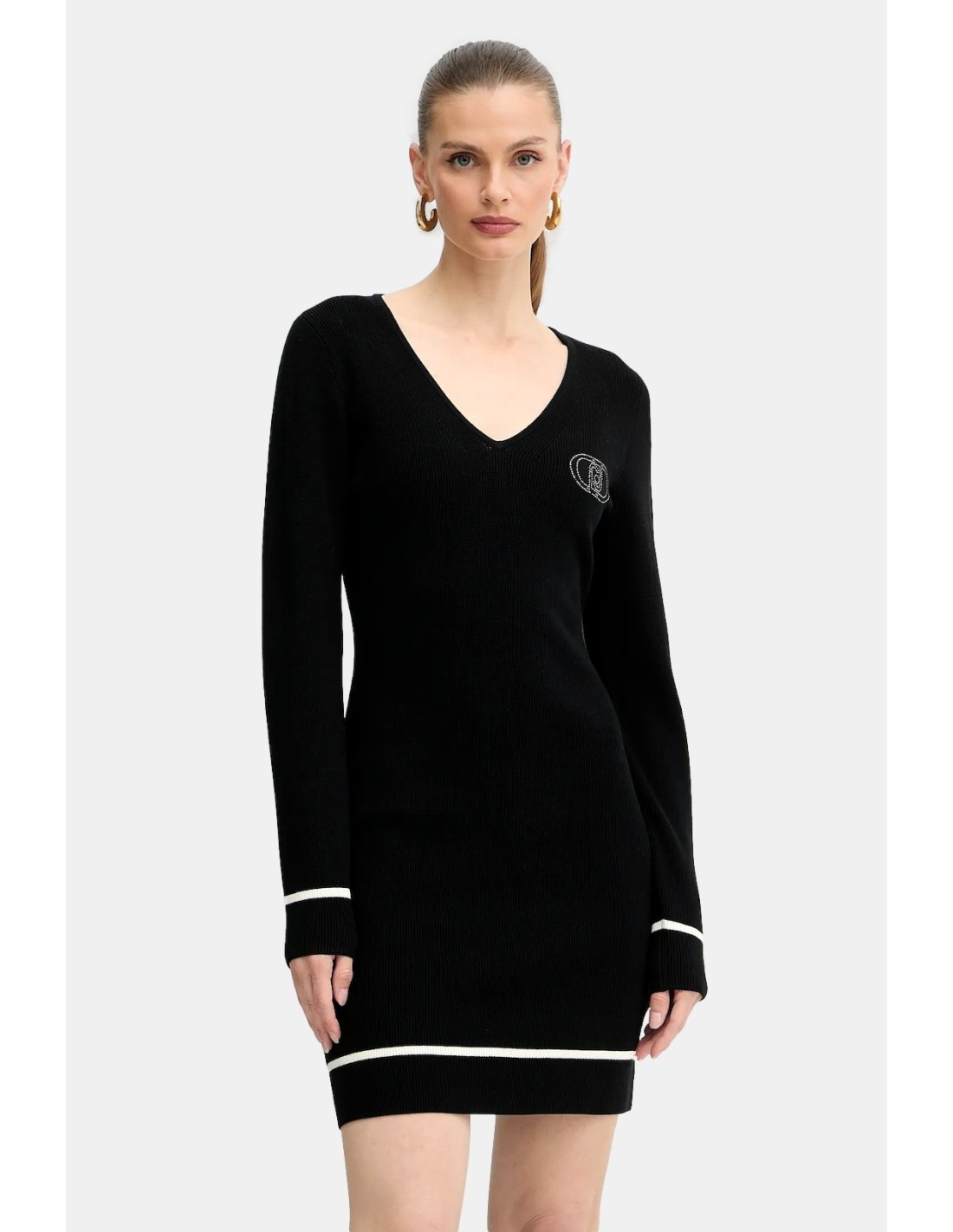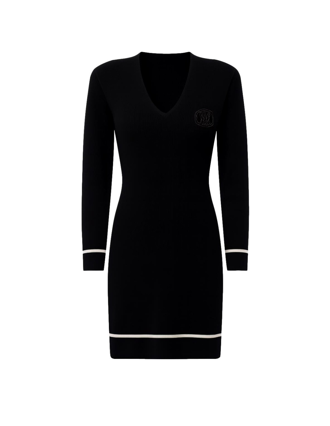 Vestido tubinho,confeccionado em malha mescla de viscose,decote em V,manga longa,detalhes em contraste,logotipo com strass,eco-friendly.
