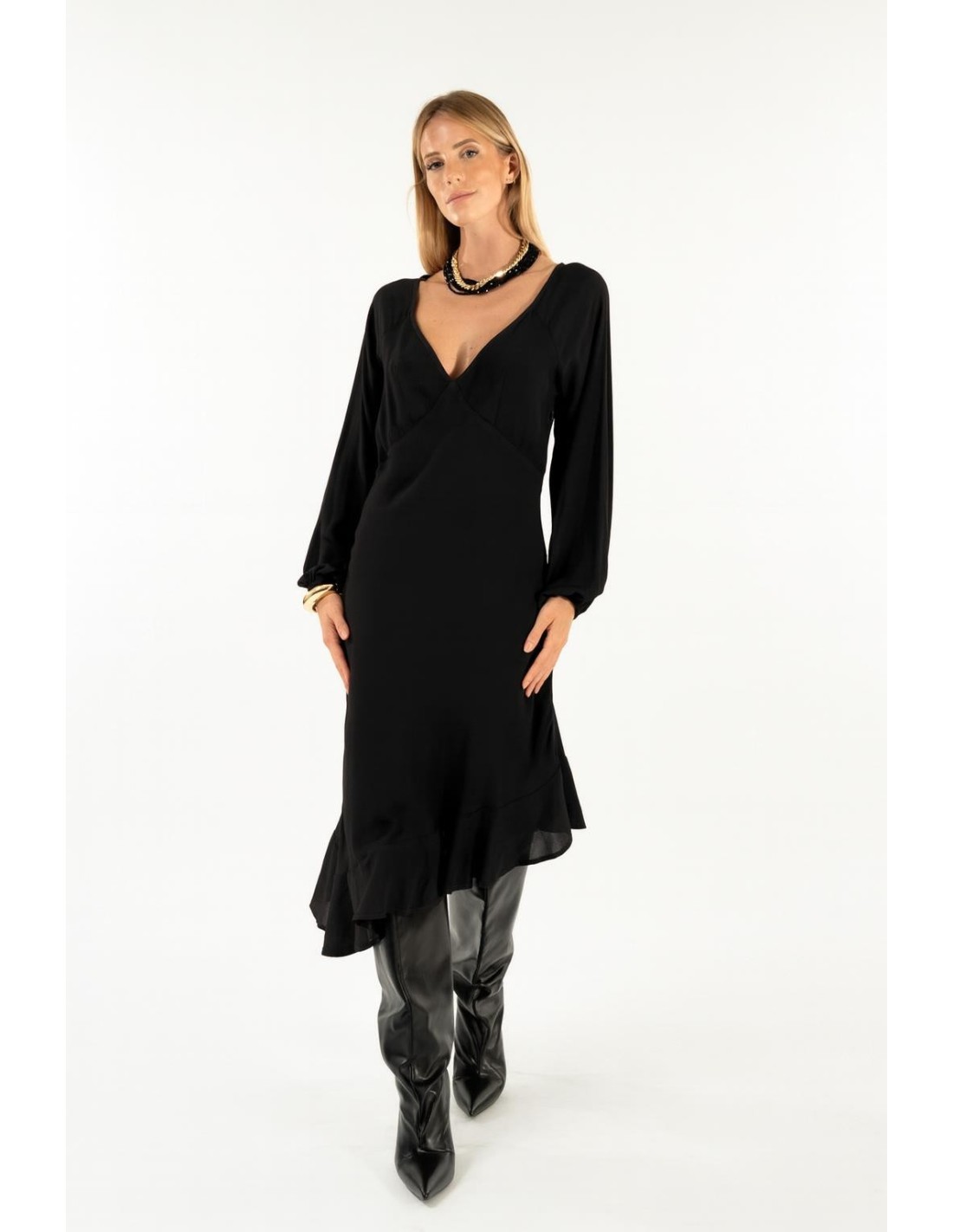 Kontatto assina um midi fluido com um corte largo que realça a cintura. Crepe leve e macio, agradável para a pele. Um decote em V adelgaçante, mangas com punhos elásticos e bainha assimétrica com folho para um movimento natural. Perfeito para o dia no escritório e para bebidas à noite com botas ou pumps.